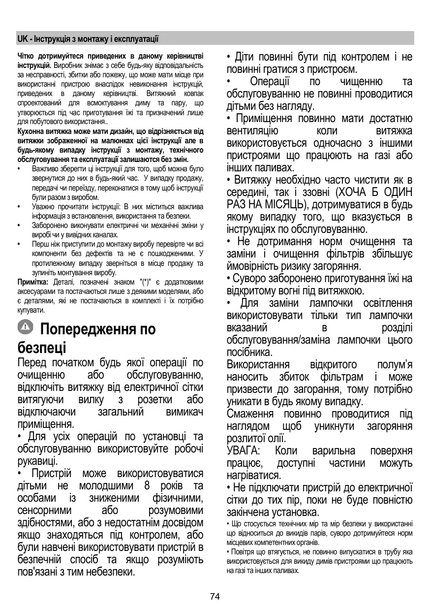 Чітко дотримуйтеся приведених в даному керівництві інструкцій. Виробник знімає з себе будь-яку відповідальність за несправності, збитки або пожежу, що може мати місце при використанні пристрою внаслідок невиконання інструкцій, приведених в даному керівництві. Витяжний ковпак спроектований для всмоктування диму та пару, що утворюється під час приготування їжі та призначений лише для побутового використання.. Кухонна витяжка може мати дизайн, що відрізняється від витяжки зображенної на малюнках цієї інструкції але в будь-якому випадку інструкції з монтажу, технічного обслуговування та експлуатації залишаются без змін. • Важливо зберегти ці інструкції для того, щоб можна було звернутися до них в будь-який час. У випадку продажу, передачі чи переїзду, переконатися в тому щоб інструкції були разом з виробом. • Уважно прочитати інструкції: В них міститься важлива інформація з встановлення, використання та безпеки. • Заборонено виконувати електричні чи механічні зміни у виробі чи у вивідних каналах. • Перш ніж приступити до монтажу виробу перевірте чи всі компоненти без дефектів та не є пошкодженими. У протилежному випадку зверніться в місце продажу та зупиніть монтування виробу. Примітка: Деталі, позначені знаком "(*)" є додатковими аксесуарами та постачаються лише з деякими моделями, або є деталями, які не постачаються в комплекті і їх потрібно купувати.