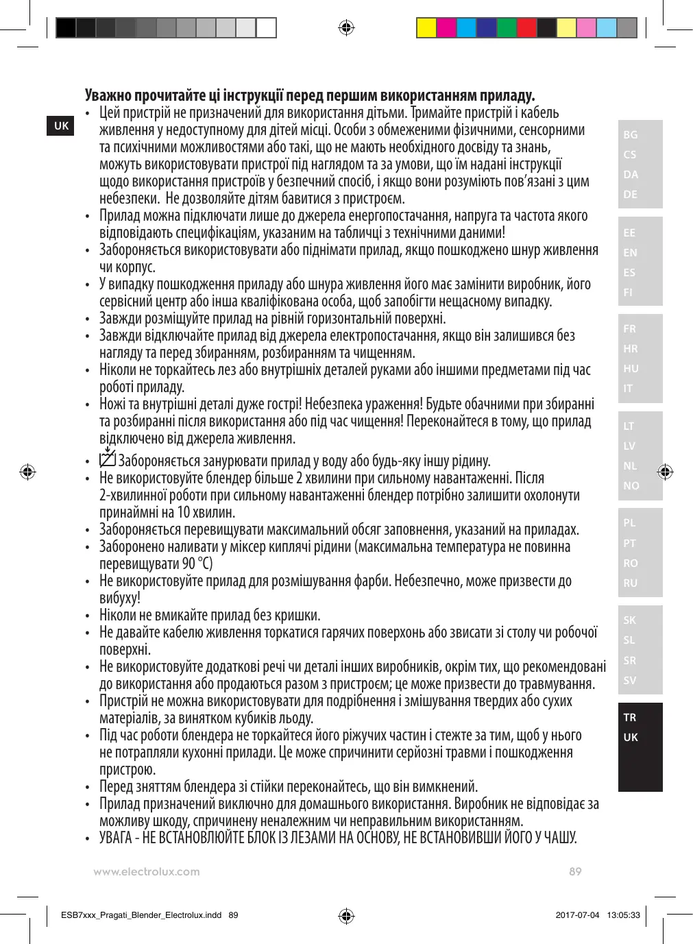Уважно прочитайте ці інструкції перед першим використанням приладу. • Цей пристрій не призначений для використання дітьми. Тримайте пристрій і кабель живлення у недоступному для дітей місці. Особи з обмеженими фізичними, сенсорними та психічними можливостями або такі, що не мають необхідного досвіду та знань, можуть використовувати пристрої під наглядом та за умови, що їм надані інструкції щодо використання пристроїв у безпечний спосіб, і якщо вони розуміють пов’язані з цим небезпеки. Не дозволяйте дітям бавитися з пристроєм. • Прилад можна підключати лише до джерела енергопостачання, напруга та частота якого відповідають специфікаціям, указаним на табличці з технічними даними! • Забороняється використовувати або піднімати прилад, якщо пошкоджено шнур живлення чи корпус. • У випадку пошкодження приладу або шнура живлення його має замінити виробник, його сервісний центр або інша кваліфікована особа, щоб запобігти нещасному випадку. • Завжди розміщуйте прилад на рівній горизонтальній поверхні. • Завжди відключайте прилад від джерела електропостачання, якщо він залишився без нагляду та перед збиранням, розбиранням та чищенням. • Ніколи не торкайтесь лез або внутрішніх деталей руками або іншими предметами під час роботі приладу. • Ножі та внутрішні деталі дуже гострі! Небезпека ураження! Будьте обачними при збиранні та розбиранні після використання або під час чищення! Переконайтеся в тому, що прилад відключено від джерела живлення. • Забороняється занурювати прилад у воду або будь-яку іншу рідину. • Не використовуйте блендер більше 2 хвилини при сильному навантаженні. Після 2-хвилинної роботи при сильному навантаженні блендер потрібно залишити охолонути принаймні на 10 хвилин. • Забороняється перевищувати максимальний обсяг заповнення, указаний на приладах. • Заборонено наливати у міксер киплячі рідини (максимальна температура не повинна перевищувати 90 °C) • Не використовуйте прилад для розмішування фарби. Небезпечно, може призвести до вибуху! • Ніколи не вмикайте прилад без кришки. • Не давайте кабелю живлення торкатися гарячих поверхонь або звисати зі столу чи робочої поверхні. • Не використовуйте додаткові речі чи деталі інших виробників, окрім тих, що рекомендовані до використання або продаються разом з пристроєм; це може призвести до травмування. • Пристрій не можна використовувати для подрібнення і змішування твердих або сухих матеріалів, за винятком кубиків льоду. • Під час роботи блендера не торкайтеся його ріжучих частин і стежте за тим, щоб у нього не потрапляли кухонні прилади. Це може спричинити серйозні травми і пошкодження пристрою. • Перед зняттям блендера зі стійки переконайтесь, що він вимкнений. • Прилад призначений виключно для домашнього використання. Виробник не відповідає за можливу шкоду, спричинену неналежним чи неправильним використанням. • УВАГА - НЕ ВСТАНОВЛЮЙТЕ БЛОК ІЗ ЛЕЗАМИ НА ОСНОВУ, НЕ ВСТАНОВИВШИ ЙОГО У ЧАШУ. www.electrolux.com