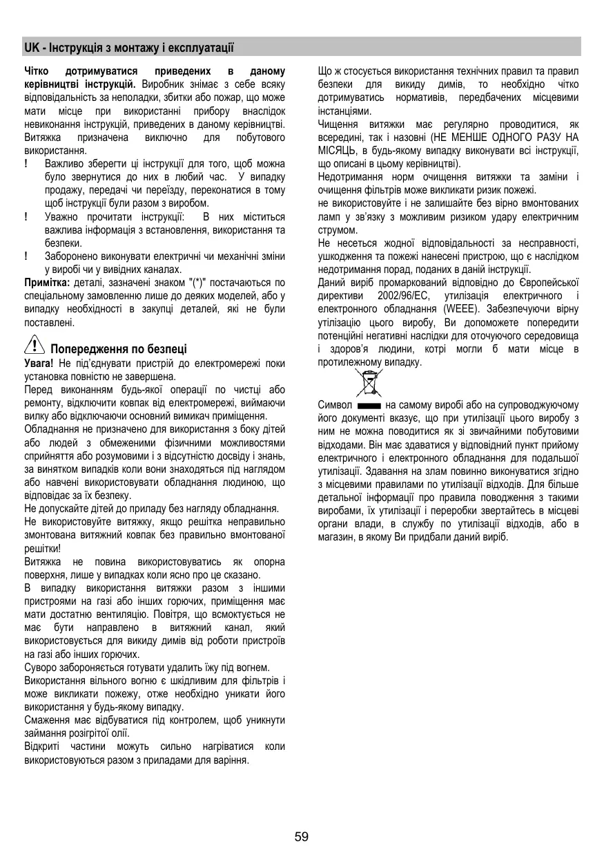 La non observation de ces normes de nettoyage de la hotte et du changement et nettoyage des filtres comporte des risques d’incendie. Ne pas utiliser ou laisser la hotte sans que les ampoules soient correctement placées pour éviter tout risque de choc électrique. La société décline toute responsabilité pour d’éventuels inconvénients, dégâts ou incendies provoqués par l’appareil et dérivés de la non observation des instructions reprises dans ce manuel. Cet appareil porte le symbole du recyclage conformément à la Directive Européenne 2002/96/CE concernant les Déchets d’Équipements Électriques et Électroniques (DEEE ou WEEE). En procédant correctement à la mise au rebut de cet appareil, vous contribuerez à empêcher toute conséquence nuisible pour l’environnement et la santé de l’homme.