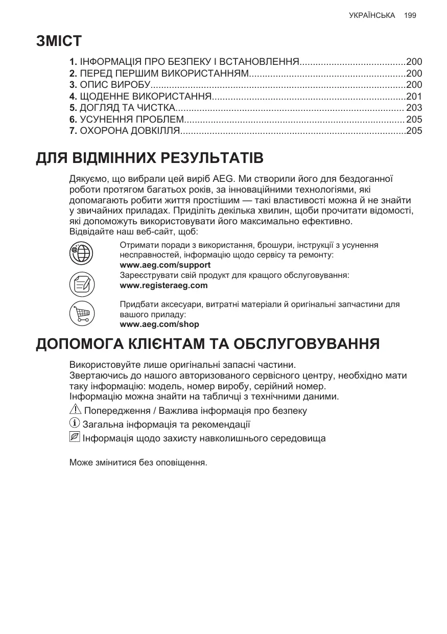 Отримати поради з використання, брошури, інструкції з усунення несправностей, інформацію щодо сервісу та ремонту: www.aeg.com/support Зареєструвати свій продукт для кращого обслуговування: www.registeraeg.com Придбати аксесуари, витратні матеріали й оригінальні запчастини для вашого приладу: www.aeg.com/shop