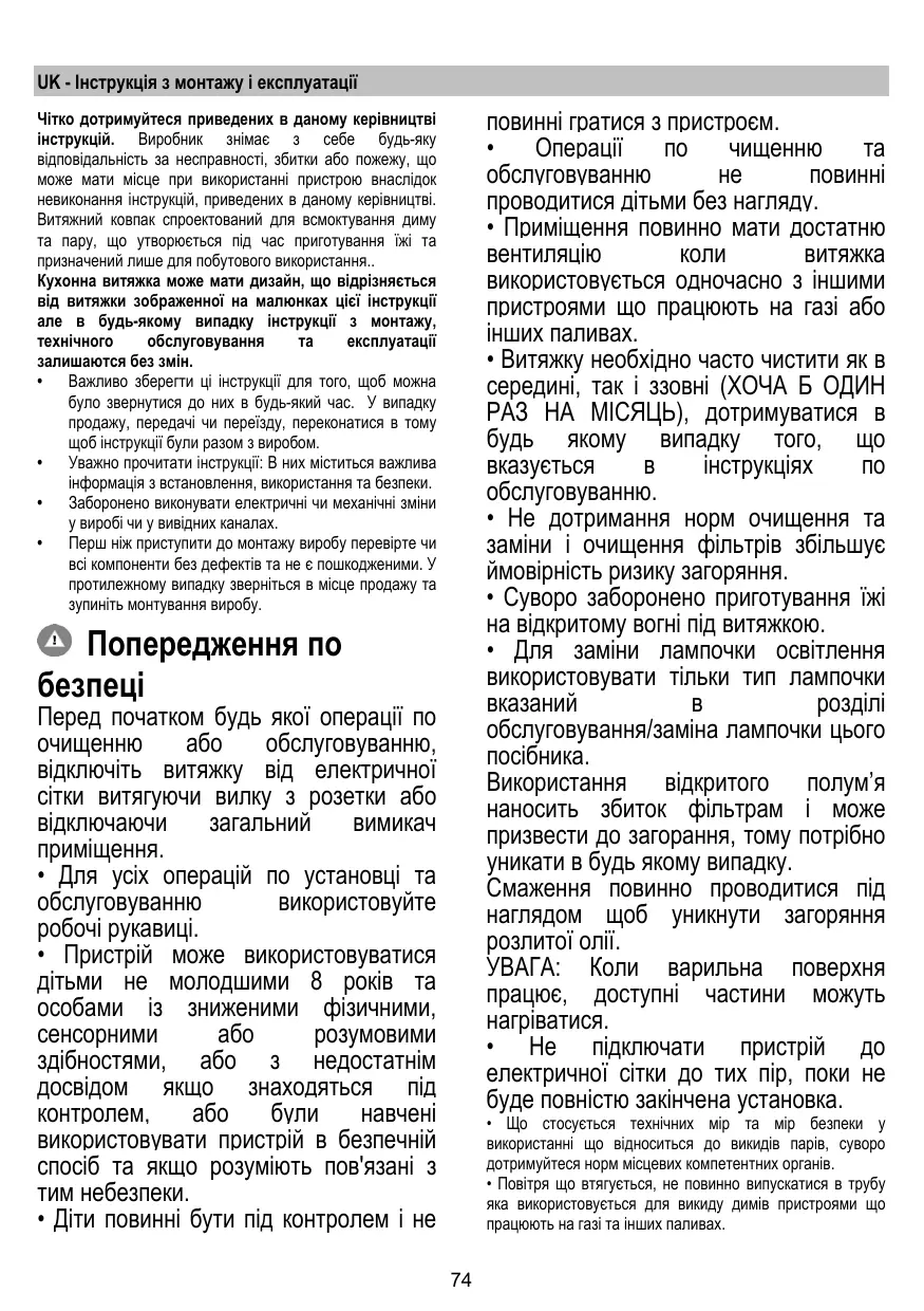 • Para la sustitución de la lámpara sólo utilizar el tipo de lámpara indicado en la sección de mantenimiento/sustitución de este manual. El uso de una llama libre es perjudicial para los filtros y puede provocar incendios, por lo tanto, debe evitarse en cualquier caso. Los fritos debe realizarse con cuidado para evitar que el aceite caliente prenda fuego. ATENCIÓN: Cuando la placa de cocción está funcionando las partes accesibles de la campana pueden calentarse. • No conectar la unidad a la red eléctrica hasta que la instalación sea totalmente completada.