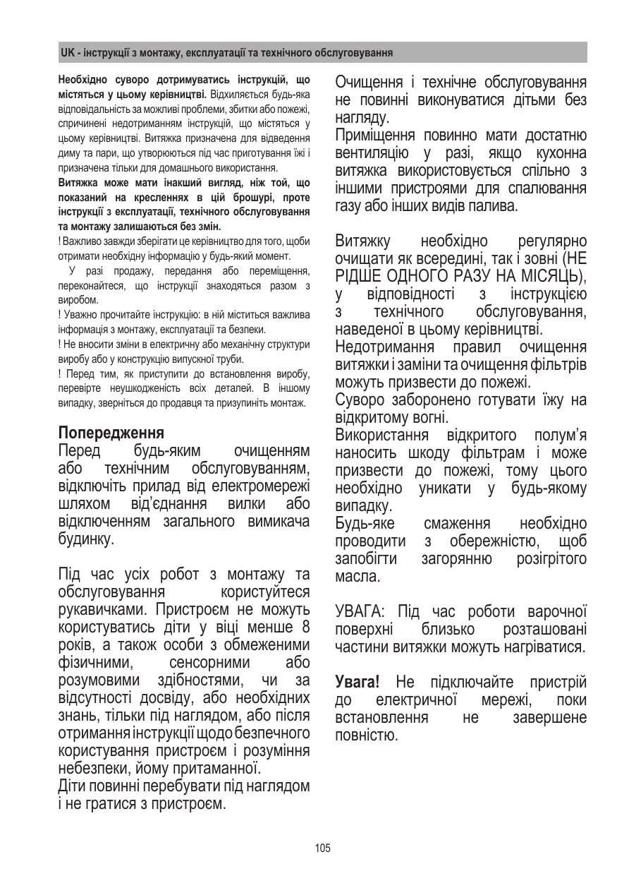 Avant toute opération de nettoyage ou d’entretien, débranchez la hotte du réseau électrique en retirant la prise ou en coupant l’interrupteur général de l’habitation. Pour toute opération d’installation et d’entretien, utilisez des gants de protection. L’appareil n’est pas destiné à une utilisation par des enfants (moins de 8 ans) ou des personnes à capacités physiques, sensorielles ou mentales réduites et sans expérience et connaissance à moins qu’ils ne soient sous la supervision ou formés sur l’utilisation de l’appareil par une personne responsable de leur sécurité. Les enfants doivent être surveillés afin qu’ils ne jouent pas avec l’appareil.