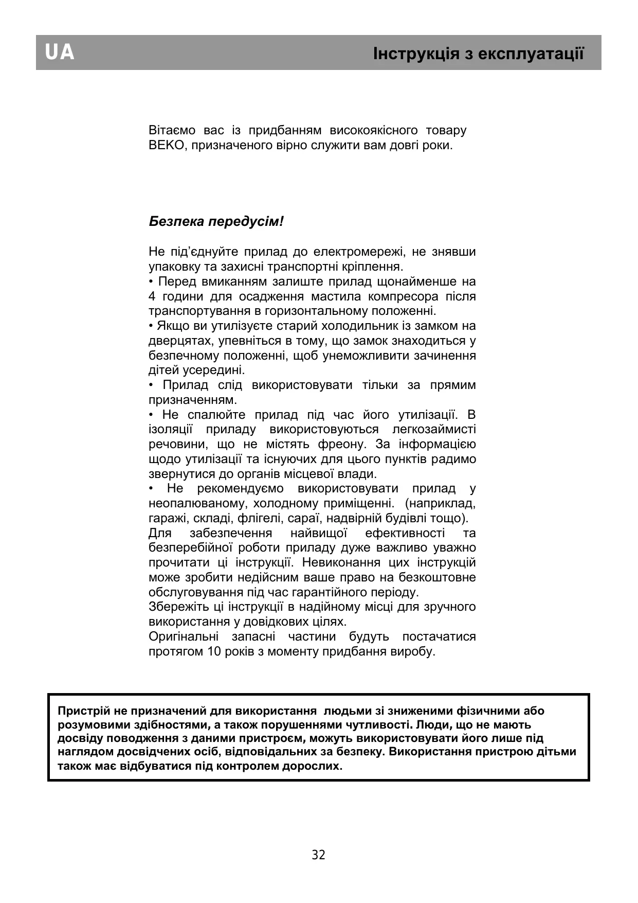 Безпека передусім! /32 Порядок підключення до електромережі /33 Інструкції з транспортування /33 Інструкції щодо встановлення /33 Короткий опис приладу /34 Рекомендації щодо розміщення продуктів у холодильнику /34 Контроль і регулювання температури /34 Перед експлуатацією /35 Зберігання заморожених продуктів /35 Заморожування свіжих продуктів /35 Приготування кубиків льоду /36 Розморожування /36 Заміна лампочки внутрішнього освітлення /36 Чищення та догляд /36 Перенавішування дверцят /37 Що слід і чого не слід робити /37 Інформація щодо робочих шумів /38 Усунення несправностей /38