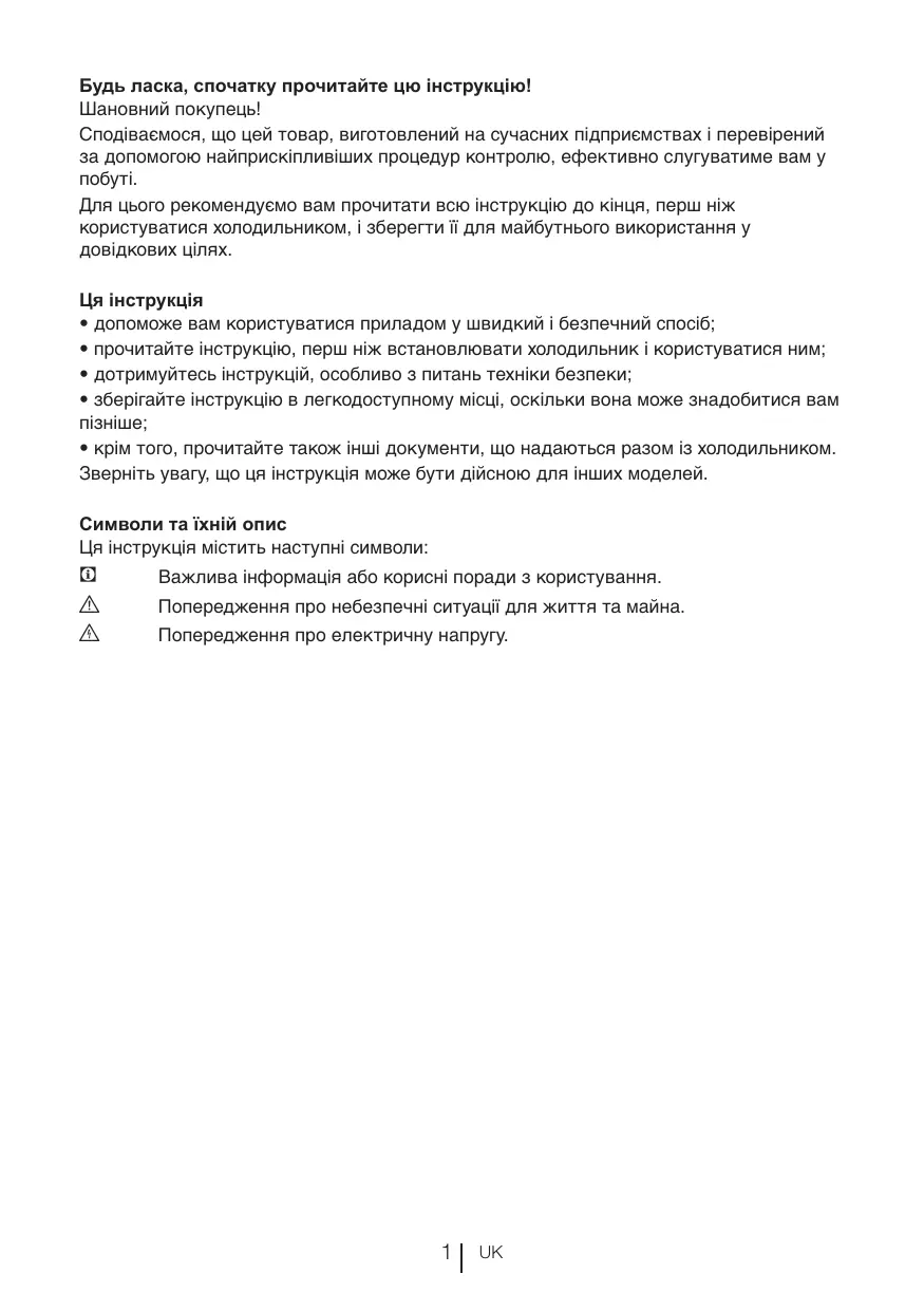 Будь ласка, спочатку прочитайте цю інструкцію! Шановний покупець! Сподіваємося, що цей товар, виготовлений на сучасних підприємствах і перевірений за допомогою найприскіпливіших процедур контролю, ефективно слугуватиме вам у побуті. Для цього рекомендуємо вам прочитати всю інструкцію до кінця, перш ніж користуватися холодильником, і зберегти її для майбутнього використання у довідкових цілях. Ця інструкція • допоможе вам користуватися приладом у швидкий і безпечний спосіб; • прочитайте інструкцію, перш ніж встановлювати холодильник і користуватися ним; • дотримуйтесь інструкцій, особливо з питань техніки безпеки; • зберігайте інструкцію в легкодоступному місці, оскільки вона може знадобитися вам пізніше; • крім того, прочитайте також інші документи, що надаються разом із холодильником. Зверніть увагу, що ця інструкція може бути дійсною для інших моделей. Символи та їхній опис Ця інструкція містить наступні символи: