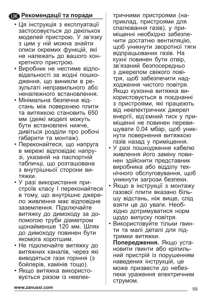 тричними пристроями (наUK Рекомендації та поради приклад, пристроями для • Ця інструкція з експлуатації спалювання газів), у призастосовується до декількох міщенні необхідно забезпемоделей пристрою. У зв’язку чити достатню вентиляцію, з цим у ній можна знайти щоб уникнути зворотної тяги описи окремих функцій, які відпрацьованих газів. На не належать до вашого конкухні повинен бути отвір, кретного пристрою. зв’язаний безпосередньо • Виробник не нестиме відпоз джерелом свіжого повівідальності за жодні пошкотря, щоб забезпечити наддження, що виникли в реходження чистого повітря. зультаті неправильного або Якщо кухонна витяжка виненалежного встановлення. користовується в поєднанні • Мінімальна безпечна відз пристроями, які працюють стань між поверхнею плити від неелектричних джерел та витяжкою становить 650 енергії, від’ємний тиск у примм (деякі моделі можуть міщенні не повинен перевибути встановлені нижче, щувати 0,04 мбар, щоб уникдивіться розділи про робочі нути повернення витяжкою габарити та монтаж). газів назад у приміщення. • Переконайтеся, що напруга • У разі пошкодження кабелю в мережі відповідає напруживлення його заміну повизі, указаній на паспортній нен здійснити представник табличці, що розташована виробника або відділу техз внутрішньої сторони винічного обслуговування, щоб тяжки. уникнути загрози безпеки. • У разі використання при• Якщо в інструкції з монтажу строїв класу I переконайтеся газової плити вказано більв тому, що внутрішнє джерешу відстань, ніж вище, слід ло живлення має відповідне взяти це до уваги. Необзаземлення. Підключайте хідно дотримуватися норм витяжку до димоходу за дощодо випуску повітря. помогою труби діаметром • Використовуйте тільки гвинщонайменше 120 мм. Шлях ти та малі деталі для піддо димоходу повинен бути тримки витяжки. якомога коротшим. Попередження. Якщо уста• Не підключайте витяжку до новити гвинти або кріпильвитяжних каналів, через які ний пристрій із порушенням виводяться гази горіння (з наведених інструкцій, це бойлерів, камінів тощо). може призвести до небез• Якщо витяжка використопеки ураження електричним вується разом із неелекструмом. www.zanussi.com