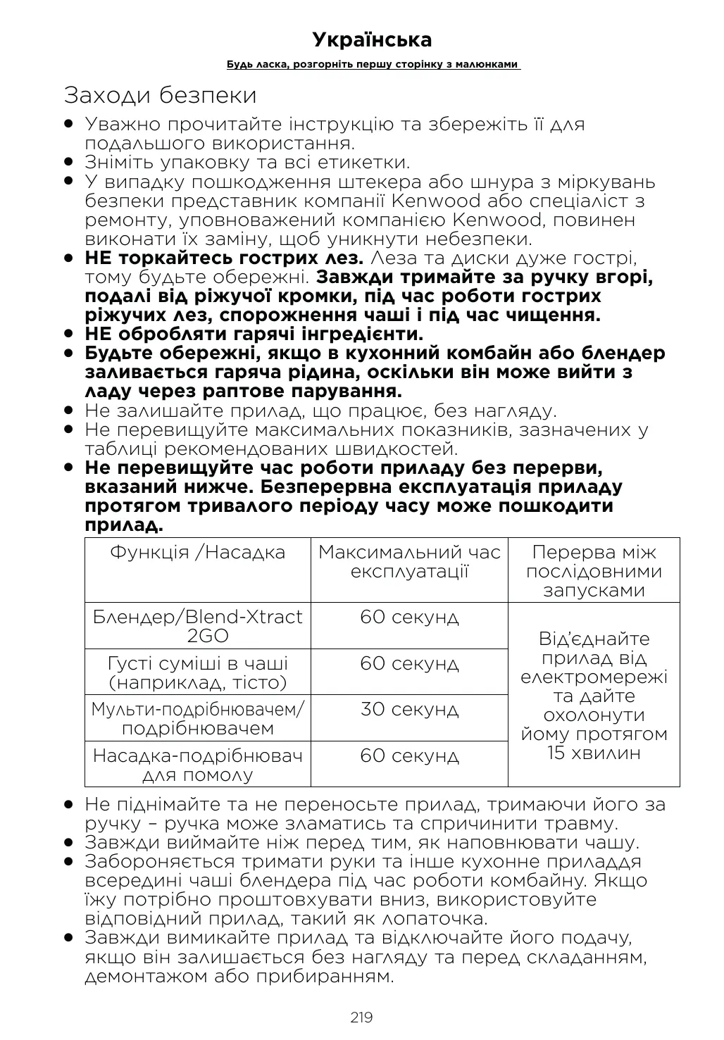 O assurez-vous que les accessoires / lames sont complètement arrêtés ; O veillez à ne pas dévisser le gobelet/la bouteille du blender ou le bol/couvercle du moulin de l’ensemble porte-lames. O Ne vous servez pas du couvercle pour arrêter ou allumer le robot ; utilisez toujours le sélecteur de vitesse Marche / Arrêt. O Cette machine sera endommagée et pourrait provoquer des blessures si le mécanisme de verrouillage est soumis à une force excessive. O N’utilisez jamais un accessoire non autorisé. O N’utilisez jamais un appareil endommagé. Faites-le vérifier ou réparer : voir « Service après-vente ». O Ne mouillez jamais le bloc moteur, le cordon d’alimentation ou la prise. O Ne laissez pas le cordon d’alimentation dépasser du bord d’une table, du plan de travail ou être en contact avec des surfaces chaudes. O Les enfants doivent être surveillés afin qu’ils ne puissent pas jouer avec cet appareil. O Cet appareil ne doit pas être utilisé par des enfants. Veuillez garder l’appareil et le cordon hors de portée des enfants. O Les appareils peuvent être utilisés par des personnes dont les capacités physiques, sensorielles ou mentales sont diminuées, ou qui ne disposent pas des connaissances ou de l’expérience nécessaires, si elles ont été formées et encadrées pour l’utilisation des appareils, et si elles ont conscience des risques encourus. O N’employez l’appareil qu’à la fin domestique prévue. Kenwood décline toute responsabilité dans les cas où l’appareil est utilisé incorrectement ou quand les présentes instructions ne sont pas respectées. O Une mauvaise utilisation de votre appareil, blender ou moulin peut provoquer des blessures. O La consommation d'énergie maximale est basée sur celle du mini-hachoir/moulin, les autres accessoires peuvent demander moins d'énergie. O