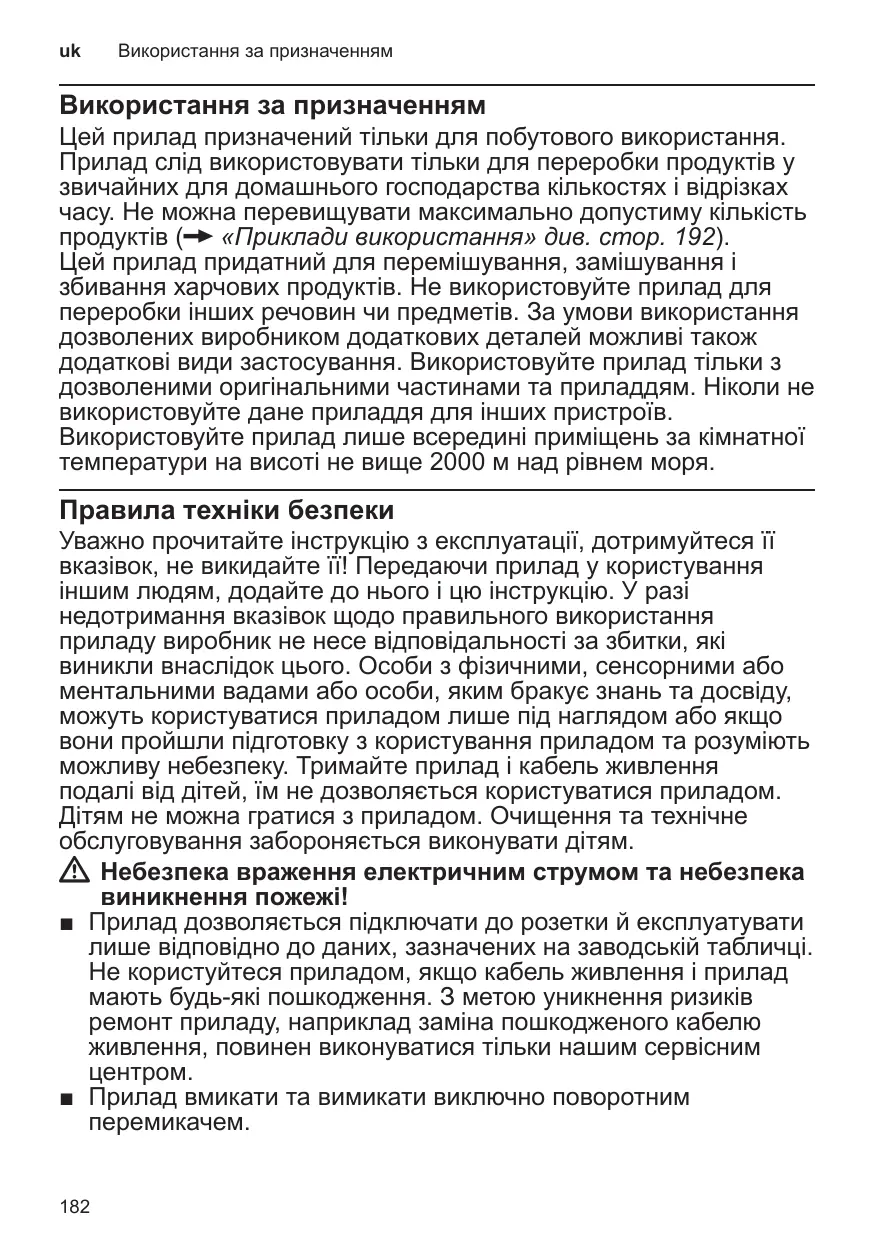 Цей прилад призначений тільки для побутового використання. Прилад слід використовувати тільки для переробки продуктів у звичайних для домашнього господарства кількостях і відрізках часу. Не можна перевищувати максимально допустиму кількість продуктів (X «Приклади використання» див. стор. 192). Цей прилад придатний для перемішування, замішування і збивання харчових продуктів. Не використовуйте прилад для переробки інших речовин чи предметів. За умови використання дозволених виробником додаткових деталей можливі також додаткові види застосування. Використовуйте прилад тільки з дозволеними оригінальними частинами та приладдям. Ніколи не використовуйте дане приладдя для інших пристроїв. Використовуйте прилад лише всередині приміщень за кімнатної температури на висоті не вище 2000 м над рівнем моря.
