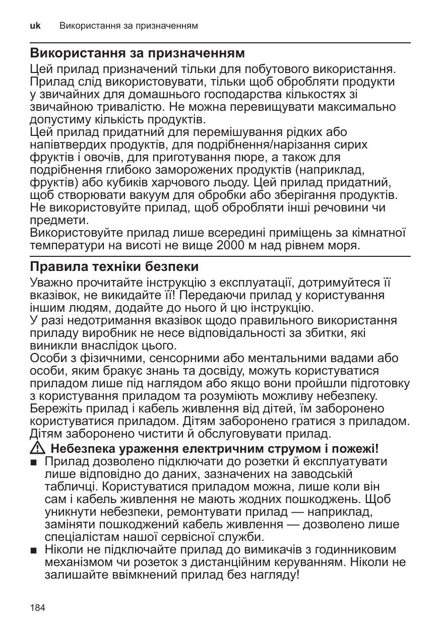 Цей прилад призначений тільки для побутового використання. Прилад слід використовувати, тільки щоб обробляти продукти у звичайних для домашнього господарства кількостях зі звичайною тривалістю. Не можна перевищувати максимально допустиму кількість продуктів. Цей прилад придатний для перемішування рідких або напівтвердих продуктів, для подрібнення/нарізання сирих фруктів і овочів, для приготування пюре, а також для подрібнення глибоко заморожених продуктів (наприклад, фруктів) або кубиків харчового льоду. Цей прилад придатний, щоб створювати вакуум для обробки або зберігання продуктів. Не використовуйте прилад, щоб обробляти інші речовини чи предмети. Використовуйте прилад лише всередині приміщень за кімнатної температури на висоті не вище 2000 м над рівнем моря.