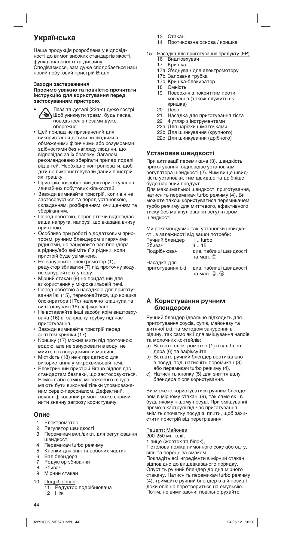 Леза та деталі (22а-с) дуже гострі! Щоб уникнути травм, будь ласка, поводьтеся з лезами дуже обережно. ñÂÈ ÔË·‰ Ì ÔËÁ̇˜ÂÌËÈ ‰Îfl ‚ËÍÓËÒÚ‡ÌÌfl ‰¥Ú¸ÏË ˜Ë β‰¸ÏË Á Ó·ÏÂÊÂÌËÏË Ù¥Á˘ÌËÏË ‡·Ó ÓÁÛÏÓ‚ËÏË Á‰¥·ÌÓÒÚflÏË ·ÂÁ ̇„Îfl‰Û β‰ËÌË, ˘Ó ‚¥‰ÔÓ‚¥‰‡π Á‡ ªı ·ÂÁÔÂÍÛ. ᇄ‡ÎÓÏ, ÂÍÓÏẨӂ‡ÌÓ Á·Â¥„‡ÚË ÔË·‰ ÔÓ‰‡Î¥ ‚¥‰ ‰¥ÚÂÈ. çÂÓ·ı¥‰ÌÓ ÍÓÌÚÓ₇ÚË, ˘Ó· ‰¥ÚË Ì ‚ËÍÓËÒÚÓ‚Û‚‡ÎË ‰‡ÌËÈ ÔËÒÚ¥È flÍ ¥„‡¯ÍÛ. Пристрій розроблений для приготування звичайних побутових кількостей. Завжди вимикайте пристрій, коли він не застосовується та перед установкою, складанням, розбиранням, очищенням та зберіганням. Перед роботою, перевірте чи відповідає ваша напруга, напрузі, що вказана внизу пристрою. Особливо при роботі з додатковим пристроєм, ручним блендером з гарячими рідинами, не занурюйте вал блендера в рідину/або вийміть її з рідини, коли пристрій буде увімкнено. Не занурюйте електромотор (1), редуктор збивалки (7) під проточну воду, не занурюйте їх у воду. Мірний стакан (9) не придатний для використання у мікрохвильовій печі. Перед роботою з насадкою для приготування їжі (15), переконайтеся, що кришка блокиратора (17c) належно клацнула та виштовхувач (16) зафіксовано. Не вставляйте інші засоби крім виштовхувача (16) в заправну трубку під час приготування. Завжди вимикайте пристрій перед зняттям кришки (17). Кришку (17) можна мити під проточною водою, але не занурювати в воду, не мийте її в посудомийній машині. Місткість (18) не є придатною для використання у мікрохвильовій печі. Електричний пристрій Braun відповідає стандартам безпеки, що застосовуються. Ремонт або заміна мережевого шнура мають бути виконані тільки уповноваженим сервіс-персоналом. Дефектний, некваліфікований ремонт може спричинити значну загрозу користувачу.
