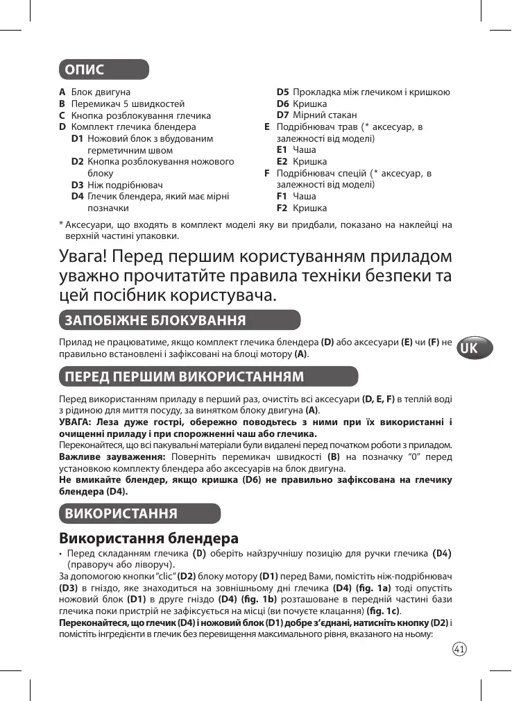 Avant la première utilisation nettoyez tous les accessoires (D, E, F) à l’eau chaude savonneuse mais pas le bloc moteur (A). ATTENTION : Les lames des couteaux sont extrêmement aiguisées, maniez-les avec précaution lors de l’utilisation, du nettoyage ou lorsque vous videz les bols. Assurez-vous que tout emballage soit retiré avant le fonctionnement de l’appareil. Remarque importante : Mettre le sélecteur de vitesse (B) sur “0” avant de placer l’ensemble blender ou les accessoires sur le bloc moteur. Ne faites pas fonctionner le bol blender si le couvercle (D6) équipé du joint (D5) n’est pas en place sur le bol (D).