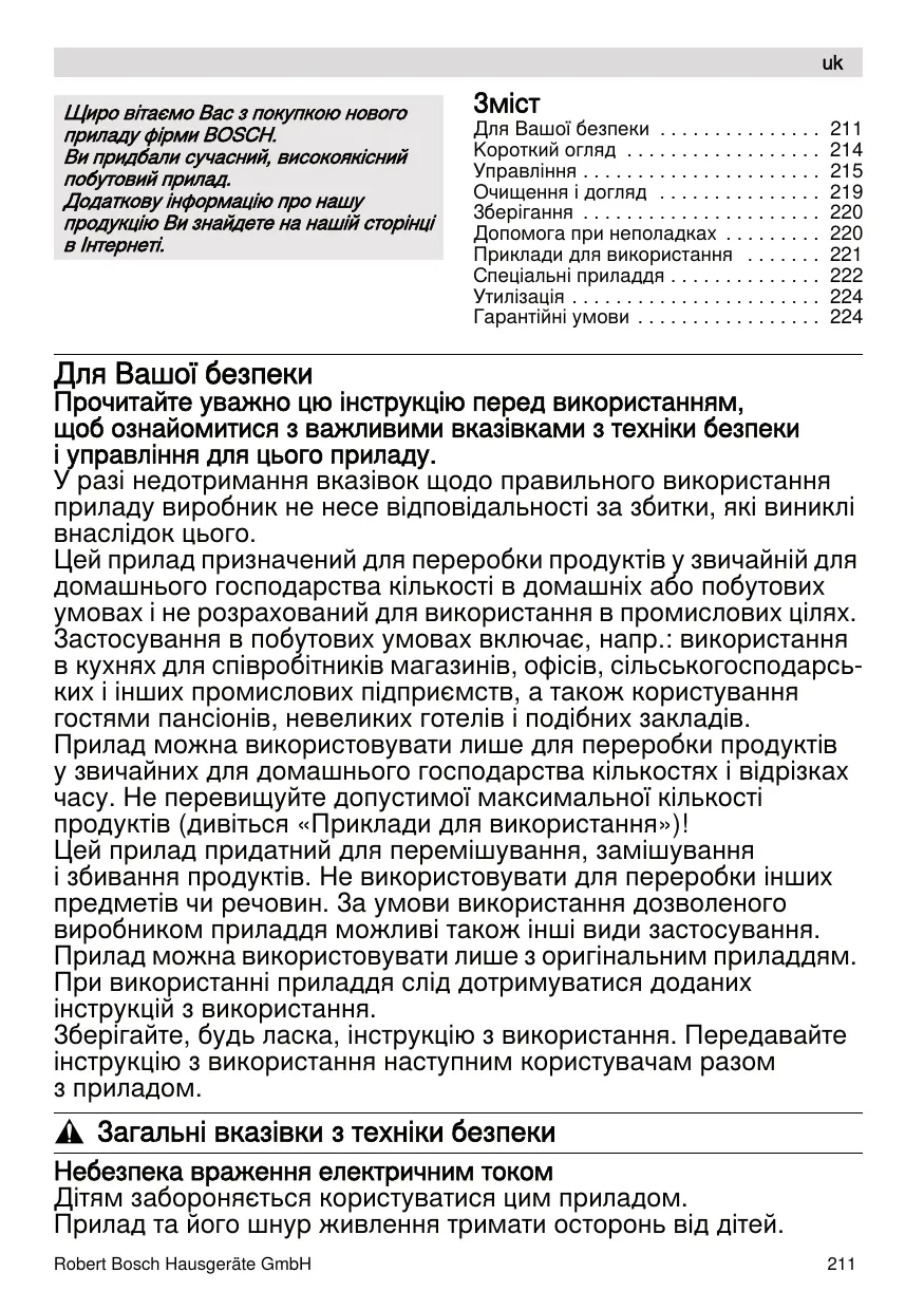 Для Вашої безпеки Прочитайте уважно цю інструкцію перед використанням, щоб ознайомитися з важливими вказівками з техніки безпеки і управління для цього приладу. У разі недотримання вказівок щодо правильного використання приладу виробник не несе відповідальності за збитки, які виниклі внаслідок цього. Цей прилад призначений для переробки продуктів у звичайній для домашнього господарства кількості в домашніх або побутових умовах і не розрахований для використання в промислових цілях. Застосування в побутових умовах включає, напр.: використання в кухнях для співробітників магазинів, офісів, сільськогосподарських і інших промислових підприємств, а також користування гостями пансіонів, невеликих готелів і подібних закладів. Прилад можна використовувати лише для переробки продуктів у звичайних для домашнього господарства кількостях і відрізках часу. Не перевищуйте допустимої максимальної кількості продуктів (дивіться «Приклади для використання»)! Цей прилад придатний для перемішування, замішування і збивання продуктів. Hе використовувати для переробки інших предметів чи речовин. За умови використання дозволеного виробником приладдя можливі також інші види застосування. Прилад можна використовувати лише з оригінальним приладдям. При використанні приладдя слiд дотримуватися доданих інструкцій з використання. Зберігайте, будь ласка, інструкцію з використання. Передавайте інструкцію з використання наступним користувачам разом з приладом. , Загальні вказівки з техніки безпеки Небезпека враження електричним током Дітям забороняється користуватися цим приладом. Прилад та його шнур живлення тримати осторонь від дітей. Robert Bosch Hausgeräte GmbH