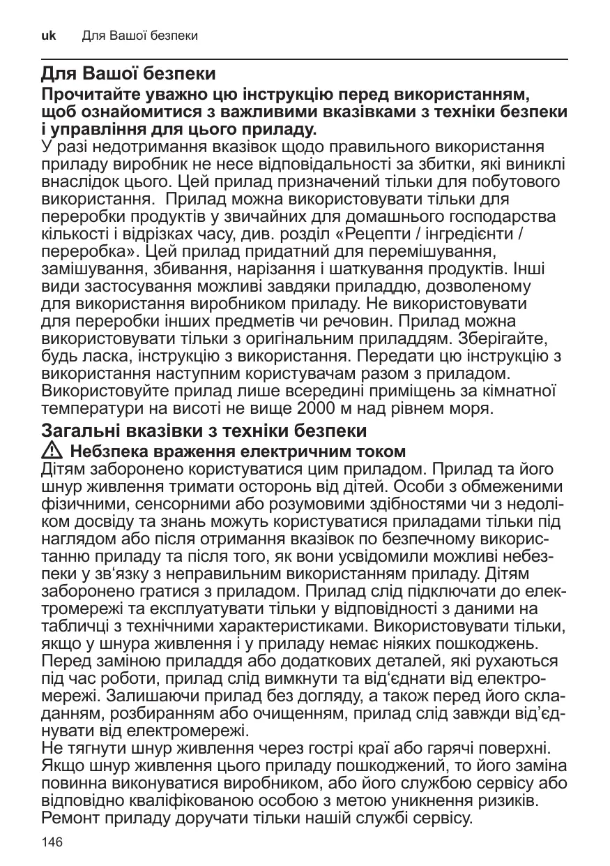 Ne plongez jamais l’appareil de base dans des liquides et ne le lavez pas au lave-vaisselle. Avant de supprimer un dérangement, débranchez la fiche mâle de la prise de courant. WW Risque de blessures avec les accessoires en rotation ! Pendant le fonctionnement, n’introduisez jamais les doigts dans le bol mélangeur. Pour pousser des ingrédients, utilisez toujours le pilon poussoir. Après que vous avez éteint l’appareil, son moteur continue de tourner brièvement. Ne changez d’accessoire qu’après avoir immobilisé l’entraînement. WW Risque de blessures avec les lames tranchantes / l’entraînement en rotation ! N’introduisez jamais les doigts dans le mixeur en place ! Ne retirez / posez le mixeur qu’après avoir arrêté l’entraînement. Ne retirez / posez le gobelet du broyeur universel qu’après avoir arrêté l’entraînement. WW Risque de blessures avec les lames tranchantes ! Ne touchez pas les lames du couteau universel avec les mains nues.Lorsque la lame universelle ne sert pas, conservez-la toujours dans le fourreau. Pour les nettoyer, utilisez une brosse. N’approchez pas les doigts des lames et des arêtes, tranchantes, des disques à réduire. Ne saisissez les disques que par la pièce en plastique au milieu ! N’introduisez pas les doigts dans l’orifice d’ajout. Pour ajouter des aliments, n’utilisez que le pilon poussoir. Ne touchez pas les lames de l’accessoire porte-lames avec les mains nues. Pour les nettoyer, utilisez une brosse. WW Risque de brûlure ! Lorsque vous traitez des aliments mélangés très chauds, de la vapeur traverse l’entonnoir ménagé dans le couvercle. Versez au maximum 0,4 litre de liquide très chaud ou moussant. Risque de blessures ! N’assemblez jamais les accessoires sur l’appareil de base.