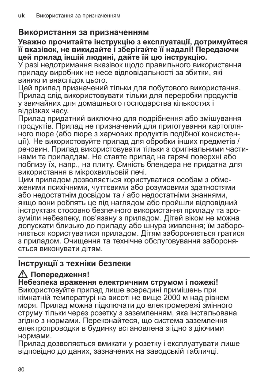 Використання за призначенням Використання за призначенням Уважно прочитайте інструкцію з експлуатації, дотримуйтеся її вказівок, не викидайте і зберігайте її надалі! Передаючи цей прилад іншій людині, дайте їй цю інструкцію. У разі недотримання вказівок щодо правильного використання приладу виробник не несе відповідальності за збитки, які виникли внаслідок цього. Цей прилад призначений тільки для побутового використання. Прилад слід використовувати тільки для переробки продуктів у звичайних для домашнього господарства кількостях і відрізках часу. Прилад придатний виключно для подрібнення або змішування продуктів. Прилад не призначений для приготування картопляного пюре (або пюре з харчових продуктів подібної консистенції). Не використовуйте прилад для обробки інших предметів / речовин. Прилад використовувати тільки з оригінальними частинами та приладдям. Не ставте прилад на гарячі поверхні або поблизу їх, напр., на плиту. Ємність блендера не придатна для використання в мікрохвильовій печі. Цим приладом дозволяється користуватися особам з обмеженими психічними, чуттєвими або розумовими здатностями або недостатнім досвідом та / або недостатніми знаннями, якщо вони роблять це під наглядом або пройшли відповідний інструктаж стосовно безпечного використання приладу та зрозуміли небезпеку, пов’язану з приладом. Дітей віком не можна допускати близько до приладу або шнура живлення; їм забороняється користуватися приладом. Дітям забороняється гратися з приладом. Очищення та технічне обслуговування забороняється виконувати дітям. Інструкції з техніки безпеки W Попередження! Небезпека враження електричним струмом і пожежі! Використовуйте прилад лише всередині приміщень при кімнатній температурі на висоті не вище 2000 м над рівнем моря. Прилад можна підключати до електромережі змінного струму тільки через розетку з заземленням, яка інстальована згідно з нормами. Пepeкoнaйтecя, щo cиcтeмa зaзeмлeння eлeктpoпpoвoдки в бyдинкy встановлена згiднo з дiючими Прилад дозволяється вмикати у розетку і експлуатувати лише відповідно до даних, зазначених на заводській табличці.