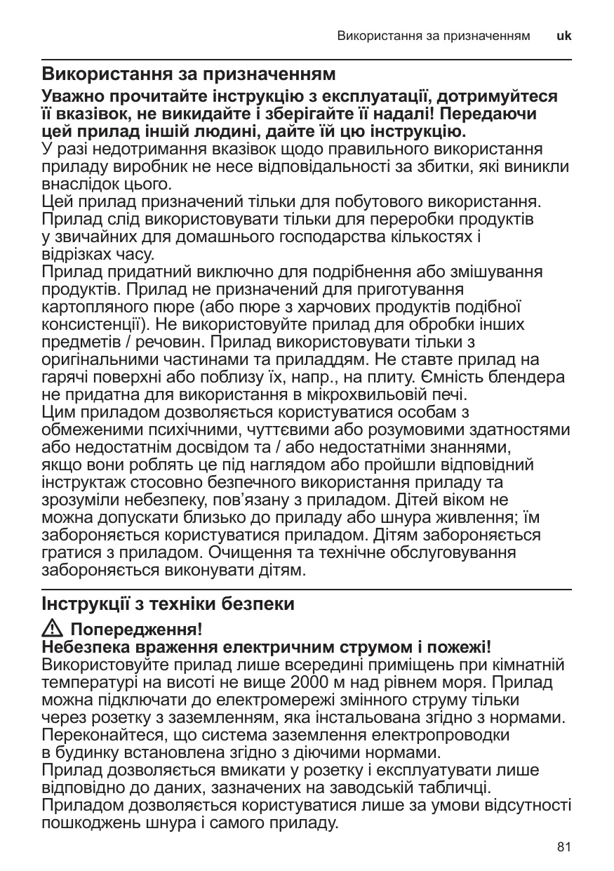 Cet appareil est destiné exclusivement à une utilisation domestique et non professionnelle. Utiliser cet appareil uniquement pour des quantités de préparations culinaires courantes et pour des durées de service normales. L’appareil ne convient que pour broyer et / ou mélanger des produits alimentaires. L’appareil n’est pas adapté pour la préparation de purée de pommes de terre (ou de purées d’aliments de consistance similaire). Il ne doit pas servir à transformer d’autres substances / objets. Utiliser l’appareil avec les pièces et accessoires d’origine uniquement. Ne jamais poser l’appareil sur des surfaces chaudes (tables de cuisson par ex.) ou à proximité de celles-ci. Le bol mixeur ne va pas au four micro-ondes. Cet appareil peut être utilisé par des personnes aux capacités physiques, sensorielles ou mentales réduites ou des personnes inexpérimentées, à condition qu’elles soient surveillées ou qu’elles aient été informées de l’utilisation de l’appareil et qu’elles comprennent les risques inhérents à son usage. Il faut tenir les enfants à l’écart de l’appareil et du cordon de branchement et ne pas leur permettre d’utiliser l’appareil. Ne pas laisser les enfants jouer avec l’appareil. Le nettoyage et l’entretien incombant à l’utilisateur ne doivent pas être effectués par des enfants.