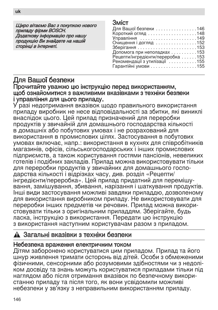 - Гарантійні умови Для Вашої безпеки Прочитайте уважно цю інструкцію перед використанням, щоб ознайомитися з важливими вказівками з техніки безпеки і управління для цього приладу. У разі недотримання вказівок щодо правильного використання приладу виробник не несе відповідальності за збитки, які виниклі внаслідок цього. Цей прилад призначений для переробки продуктів у звичайній для домашнього господарства кількості в домашніх або побутових умовах і не розрахований для використання в промислових цілях. Застосування в побутових умовах включає, напр.: використання в кухнях для співробітників магазинів, офісів, сільськогосподарських і інших промислових підприємств, а також користування гостями пансіонів, невеликих готелів і подібних закладів. Прилад можна використовувати тiльки для переробки продуктів у звичайних для домашнього господарства кількості і відрізках часу, див. розділ «Рецепти/ інгредієнти/переробка». Цей прилад придатний для перемішування, замішування, збивання, нарізання і шаткування продуктів. Інші види застосування можливі завдяки приладдю, дозволеному для використання виробником приладу. Hе використовувати для переробки інших предметів чи речовин. Прилад можна використовувати тiльки з оригінальним приладдям. Зберігайте, будь ласка, інструкцію з використання. Передати цю інструкцію з використання наступним користувачам разом з приладом. , Загальні вказівки з техніки безпеки Небезпека враження електричним током Дітям заборонено користуватися цим приладом. Прилад та його шнур живлення тримати осторонь від дітей. Особи з обмеженими фізичними, сенсорними або розумовими здібностями чи з недоліком досвіду та знань можуть користуватися приладами тільки під наглядом або після отримання вказівок по безпечному використанню приладу та після того, як вони усвідомили можливі небезпеки у зв'язку з неправильним використанням приладу. p. 155