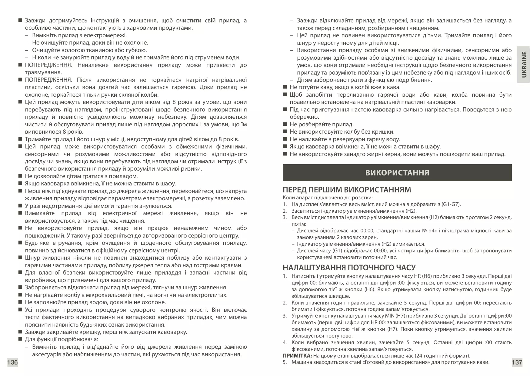 11. Cuando llegue la hora preajustada, se iniciará automáticamente el ciclo de preparación del café: – El indicador de la hora preajustada (G7) se apagará. – El indicador de encendido/apagado (H2) parpadeará. – El indicador de funcionamiento (G4) parpadeará. – El agua caliente pasará por el café molido en el filtro. 12. Cuando finalice el ciclo del café: – El indicador de encendido/apagado (H2) dejará de parpadear y se iluminará. – El indicador de funcionamiento (G4) se detendrá y se apagará. – El indicador de la hora preajustada (G7) se apagará. – El aparato entrará en el modo de mantenimiento del calor durante 30 minutos. – El Indicador de encendido/apagado (H2) se apagará después del mantenimiento del calor.