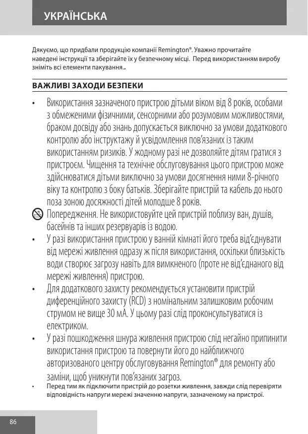 • Lorsque l’appareil est utilisé dans une salle de bains, débranchez-le après usage. La proximité de l’eau présente un danger même lorsque l’appareil est éteint. • Pour une protection supplémentaire, l’installation de courant résiduel (RCD) avec un differentiel residuel nominal ne dépassant pas 30mA est recommandée. Demandez de l’aide à un électricien. • Si le cordon d’alimentation de cet appareil est endommagé, cessez immédiatement d’utiliser l’appareil et renvoyez-le au service consommateurs Remington agréé le plus proche en vue de sa réparation ou de sa substitution afin d’éviter tout risque.