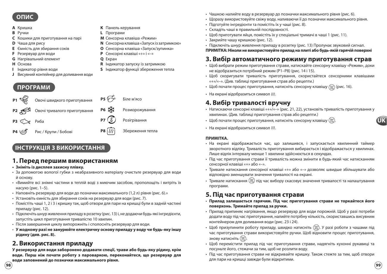 Programmes Touche Mode • Lavez toutes les pièces amovibles à l’eau tiède avec du liquide vaisselle, rincez et séchez – fig. 1-5. ou au lave-vaisselle. • Remplissez le réservoir d’eau jusqu’au niveau MAX (1,2L) fig. 6. • Placez le récupérateur à jus sur le réservoir - fig. 7. • Placez le bol 1,2 et 3 et le couvercle, en plaçant le couvercle de façon à ce que les trous d’évacuation se trouvent à l’arrière du produit - fig. 12. • Branchez l’appareil – fig. 13 et lancez un cycle de cuisson à vide de 10 minutes. • A la fin du cycle, videz l’eau du réservoir et rincez. • Ne jamais immerger l’appareil dans l’eau ou tout autre liquide – fig. 4.