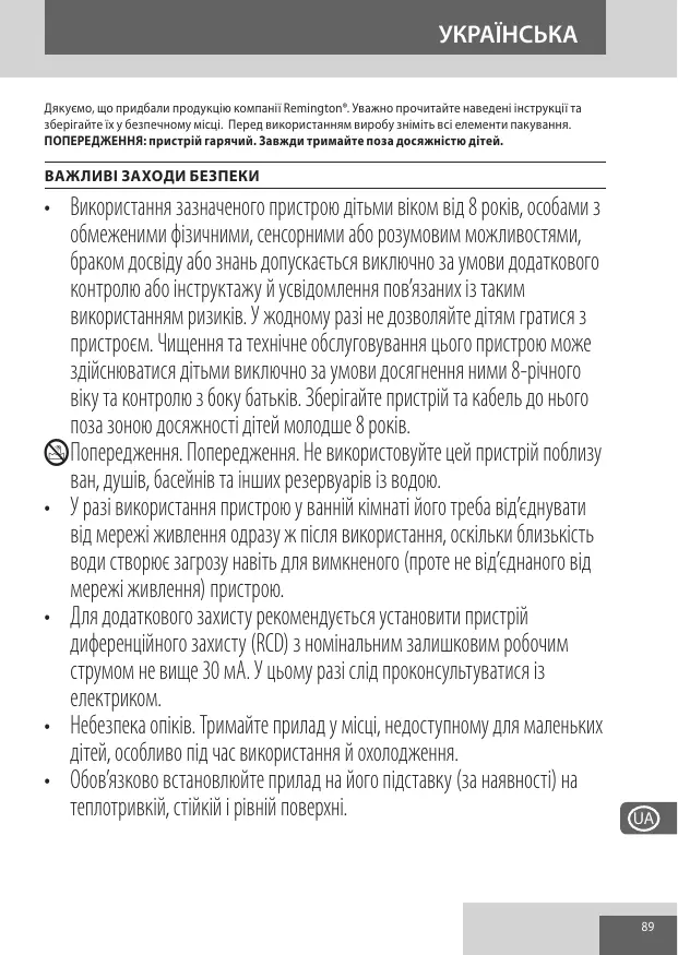 Tenez l’appareil et le câble hors de portée des enfants de moins de 8 ans. L Avertissement : Veillez à ne pas utiliser cet appareil à proximité de baignoires, douches, lavabos ou autres récipients contenant de l’eau. • Lorsque l’appareil est utilisé dans une salle de bains, débranchez-le après usage. La proximité de l’eau présente un danger même lorsque l’appareil est éteint. • Pour une protection supplémentaire, l’installation de courant résiduel (RCD)avec un differentiel residuel nominal ne dépassant pas 30mA est recommandée. Demandez de l’aide à un électricien. • Risque de brûlure. Veillez à maintenir l’appareil hors de portée des jeunes enfants, en particulier lorsque vous utilisez l’appareil et lorsqu’il refroidit. • Placez toujours l’appareil avec son support, le cas échéant, sur une surface plate, stable et résistante à la chaleur. • Ne laissez en aucun cas l’appareil sans surveillance quand il est connecté au réseau électrique. • Si le cordon d’alimentation de cet appareil est endommagé, cessez immédiatement d’utiliser l’appareil et renvoyez-le au service consommateurs Remington agréé le plus proche en vue de sa réparation ou de sa substitution afin d’éviter tout risque.