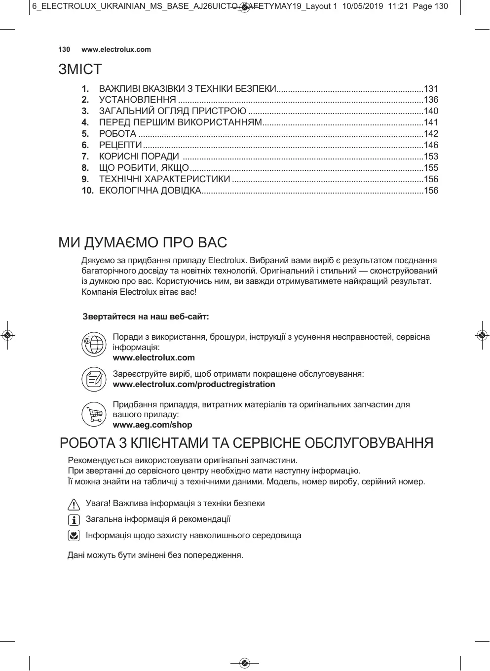 • ЕКОЛОГІчНА ДОВІДКА МИ ДУМАЄМО ПРО ВАС Дякуємо за придбання приладу Electrolux. Вибраний вами виріб є результатом поєднання багаторічного досвіду та новітніх технологій. Оригінальний і стильний — сконструйований із думкою про вас. Користуючись ним, ви завжди отримуватимете найкращий результат. Компанія Electrolux вітає вас! Звертайтеся на наш веб-сайт: Поради з використання, брошури, інструкції з усунення несправностей, сервісна інформація: www.electrolux.com Зареєструйте виріб, щоб отримати покращене обслуговування: www.electrolux.com/productregistration Придбання приладдя, витратних матеріалів та оригінальних запчастин для вашого приладу: www.aeg.com/shop РОБОТА З КЛІЄНТАМИ ТА СЕРВІСНЕ ОБСЛУГОВУВАННЯ Рекомендується використовувати оригінальні запчастини. При звертанні до сервісного центру необхідно мати наступну інформацію. Її можна знайти на табличці з технічними даними. Модель, номер виробу, серійний номер. Увага! Важлива інформація з техніки безпеки Загальна інформація й рекомендації Інформація щодо захисту навколишнього середовища Дані можуть бути змінені без попередження. 6_ELECTROLUX_UKRAINIAN_MS_BASE_AJ26UICTO_SAFETYMAY19_Layout 1 10/05/2019 11:21 Page 131 p. 156