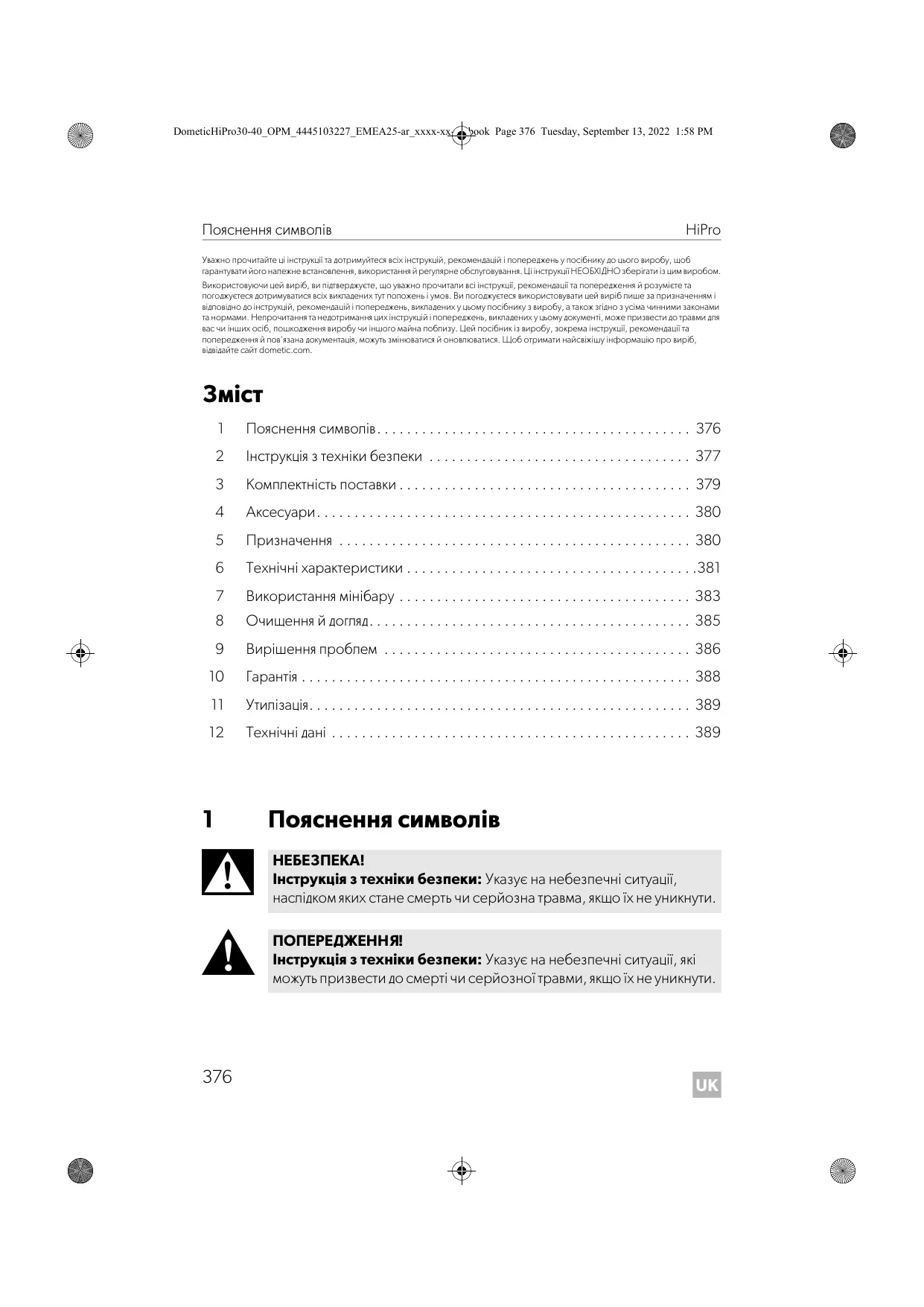 • неправильне обслуговування чи використання неоригінальних запасних частин (не наданих оригінальним виробником); • внесення змін у мінібар без явного схвалення від виробника; • використання з метою, відмінною від описаної в цьому посібнику. Dometic залишає за собою право змінювати зовнішній вигляд виробу та його технічні характеристики.