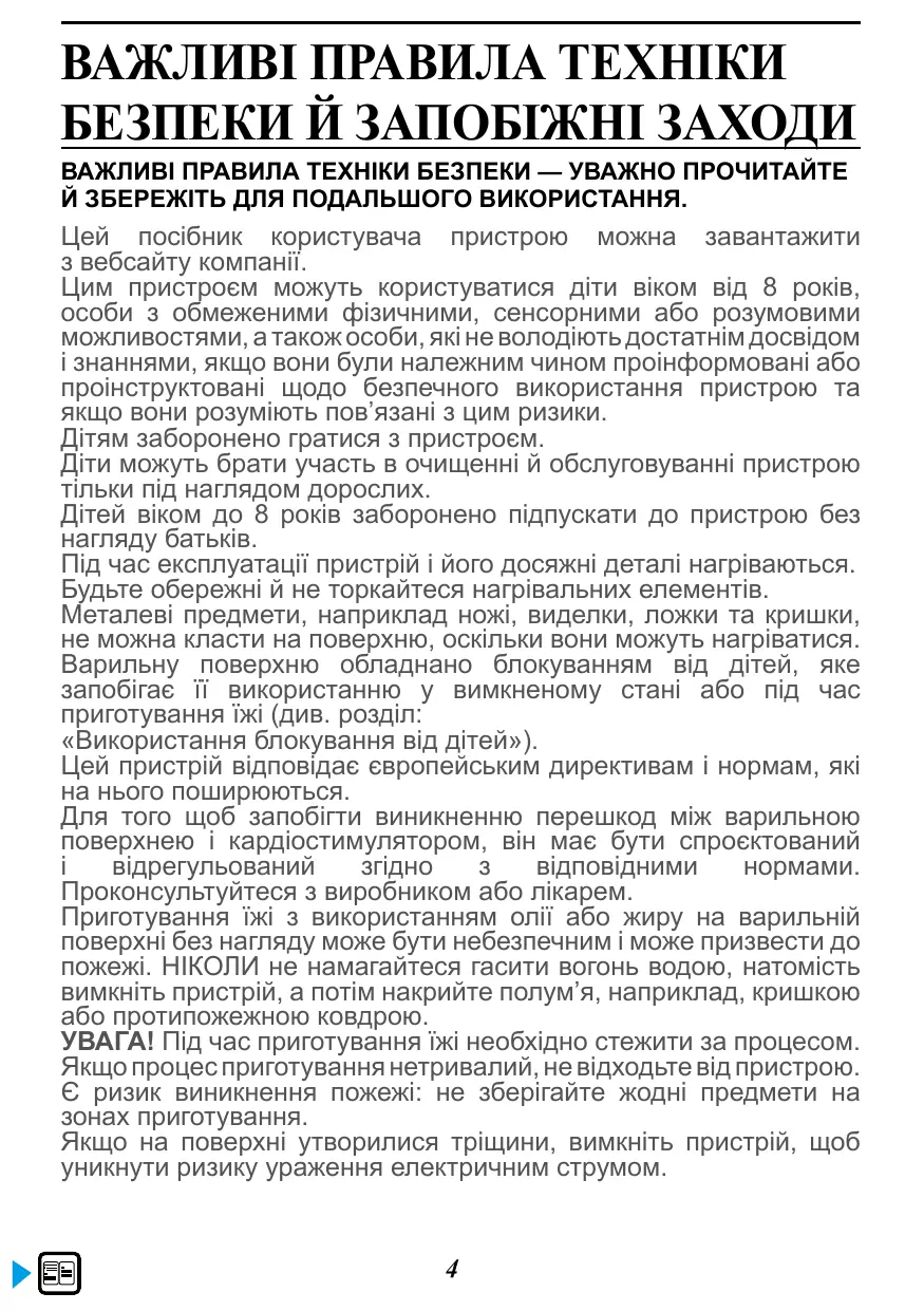 Цей посібник користувача пристрою можна завантажити з вебсайту компанії. Цим пристроєм можуть користуватися діти віком від 8 років, особи з обмеженими фізичними, сенсорними або розумовими можливостями, а також особи, які не володіють достатнім досвідом і знаннями, якщо вони були належним чином проінформовані або проінструктовані щодо безпечного використання пристрою та якщо вони розуміють пов’язані з цим ризики. Дітям заборонено гратися з пристроєм. Діти можуть брати участь в очищенні й обслуговуванні пристрою тільки під наглядом дорослих. Дітей віком до 8 років заборонено підпускати до пристрою без нагляду батьків. Під час експлуатації пристрій і його досяжні деталі нагріваються. Будьте обережні й не торкайтеся нагрівальних елементів. Металеві предмети, наприклад ножі, виделки, ложки та кришки, не можна класти на поверхню, оскільки вони можуть нагріватися. Варильну поверхню обладнано блокуванням від дітей, яке запобігає її використанню у вимкненому стані або під час приготування їжі (див. розділ: «Використання блокування від дітей»). Цей пристрій відповідає європейським директивам і нормам, які на нього поширюються. Для того щоб запобігти виникненню перешкод між варильною поверхнею і кардіостимулятором, він має бути спроєктований і відрегульований згідно з відповідними нормами. Проконсультуйтеся з виробником або лікарем. Приготування їжі з використанням олії або жиру на варильній поверхні без нагляду може бути небезпечним і може призвести до пожежі. НІКОЛИ не намагайтеся гасити вогонь водою, натомість вимкніть пристрій, а потім накрийте полум’я, наприклад, кришкою або протипожежною ковдрою. УВАГА! Під час приготування їжі необхідно стежити за процесом. Якщо процес приготування нетривалий, не відходьте від пристрою. Є ризик виникнення пожежі: не зберігайте жодні предмети на зонах приготування. Якщо на поверхні утворилися тріщини, вимкніть пристрій, щоб уникнути ризику ураження електричним струмом.