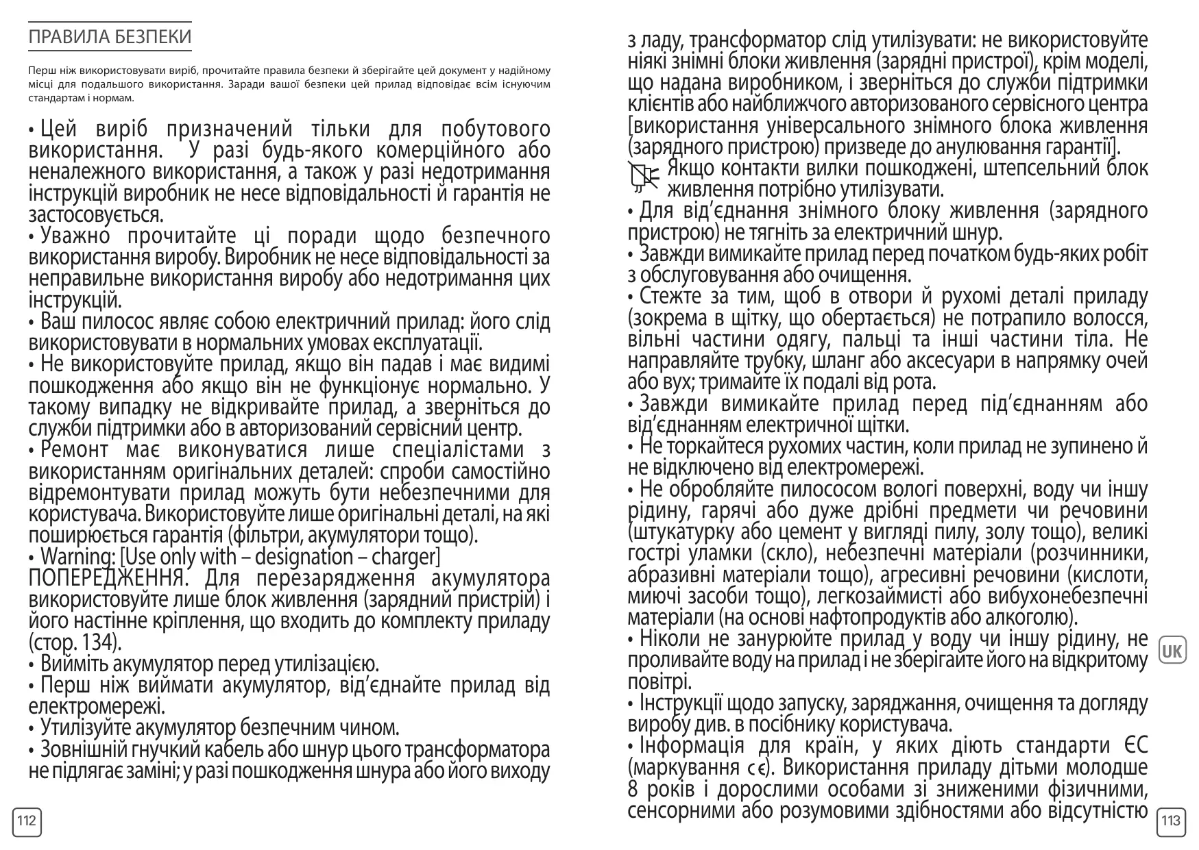 • Цей виріб призначений тільки для побутового використання. У разі будь-якого комерційного або неналежного використання, а також у разі недотримання інструкцій виробник не несе відповідальності й гарантія не застосовується. • Уважно прочитайте ці поради щодо безпечного використання виробу. Виробник не несе відповідальності за неправильне використання виробу або недотримання цих інструкцій. • Ваш пилосос являє собою електричний прилад: його слід використовувати в нормальних умовах експлуатації. • Не використовуйте прилад, якщо він падав і має видимі пошкодження або якщо він не функціонує нормально. У такому випадку не відкривайте прилад, а зверніться до служби підтримки або в авторизований сервісний центр. • Ремонт має виконуватися лише спеціалістами з використанням оригінальних деталей: спроби самостійно відремонтувати прилад можуть бути небезпечними для користувача. Використовуйте лише оригінальні деталі, на які поширюється гарантія (фільтри, акумулятори тощо). • Warning: [Use only with – designation – charger] ПОПЕРЕДЖЕННЯ. Для перезарядження акумулятора використовуйте лише блок живлення (зарядний пристрій) і його настінне кріплення, що входить до комплекту приладу (стор. 134). • Вийміть акумулятор перед утилізацією. • Перш ніж виймати акумулятор, від’єднайте прилад від електромережі. • Утилізуйте акумулятор безпечним чином. • Зовнішній гнучкий кабель або шнур цього трансформатора не підлягає заміні; у разі пошкодження шнура або його виходу 112