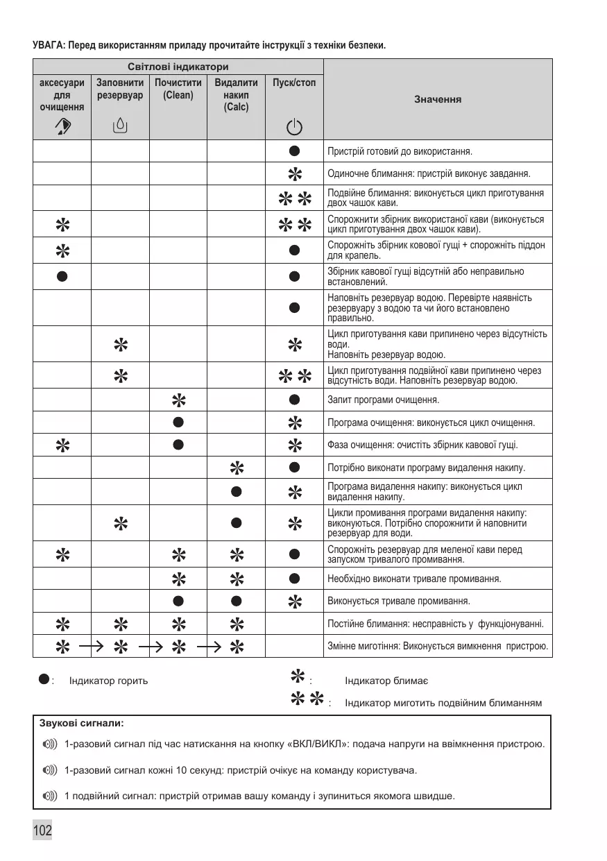 El ciclo de café ha parado por falta de agua. Llene el depósito con agua. El ciclo doble de café ha parado por falta de agua. Llene el depósito con agua. Programa de limpieza solicitado. Programa de limpieza: ciclo de limpieza en curso. Fase de limpieza: vaciar la bandeja de posos. Programa de descalcificación solicitado. Programa de descalcificación: ciclo de descalcificación en curso. Ciclos de aclarado del programa de descalcificación: en curso. Solicitud de vaciado y de llenado del depósito de agua. Vaciar el depósito de posos de café antes de iniciar un aclarado largo. Pide un aclarado largo. Aclarado largo en curso. Parpadeo permanente: anomalía de funcionamiento. Parpadeo alternativo: desconexión del aparato de la fuente de alimentación en curso. :