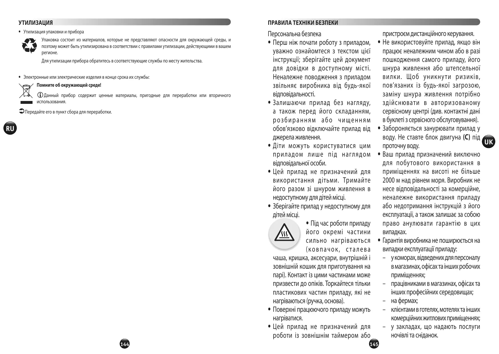 Персональна безпека • Перш ніж почати роботу з приладом, уважно ознайомтеся з текстом цієї інструкції; зберігайте цей документ для довідки в доступному місті. Неналежне поводження з приладом звільняє виробника від будь-якої відповідальності. • Залишаючи прилад без нагляду, а також перед його складанням, розбиранням або чищенням обов’язково відключайте прилад від джерела живлення. • Діти можуть користуватися цим приладом лише під наглядом відповідальної особи. • Цей прилад не призначений для використання дітьми. Тримайте його разом зі шнуром живлення в недоступному для дітей місці. • Зберігайте прилад у недоступному для дітей місці. • Під час роботи приладу його окремі частини сильно нагріваються ( к о в п ач о к , с та л е в а чаша, кришка, аксесуари, внутрішній і зовнішній кошик для приготування на парі). Контакт із цими частинами може призвести до опіків. Торкайтеся тільки пластикових частин приладу, які не нагріваються (ручка, основа). • Поверхні працюючого приладу можуть нагріватися. • Цей прилад не призначений для роботи із зовнішнім таймером або