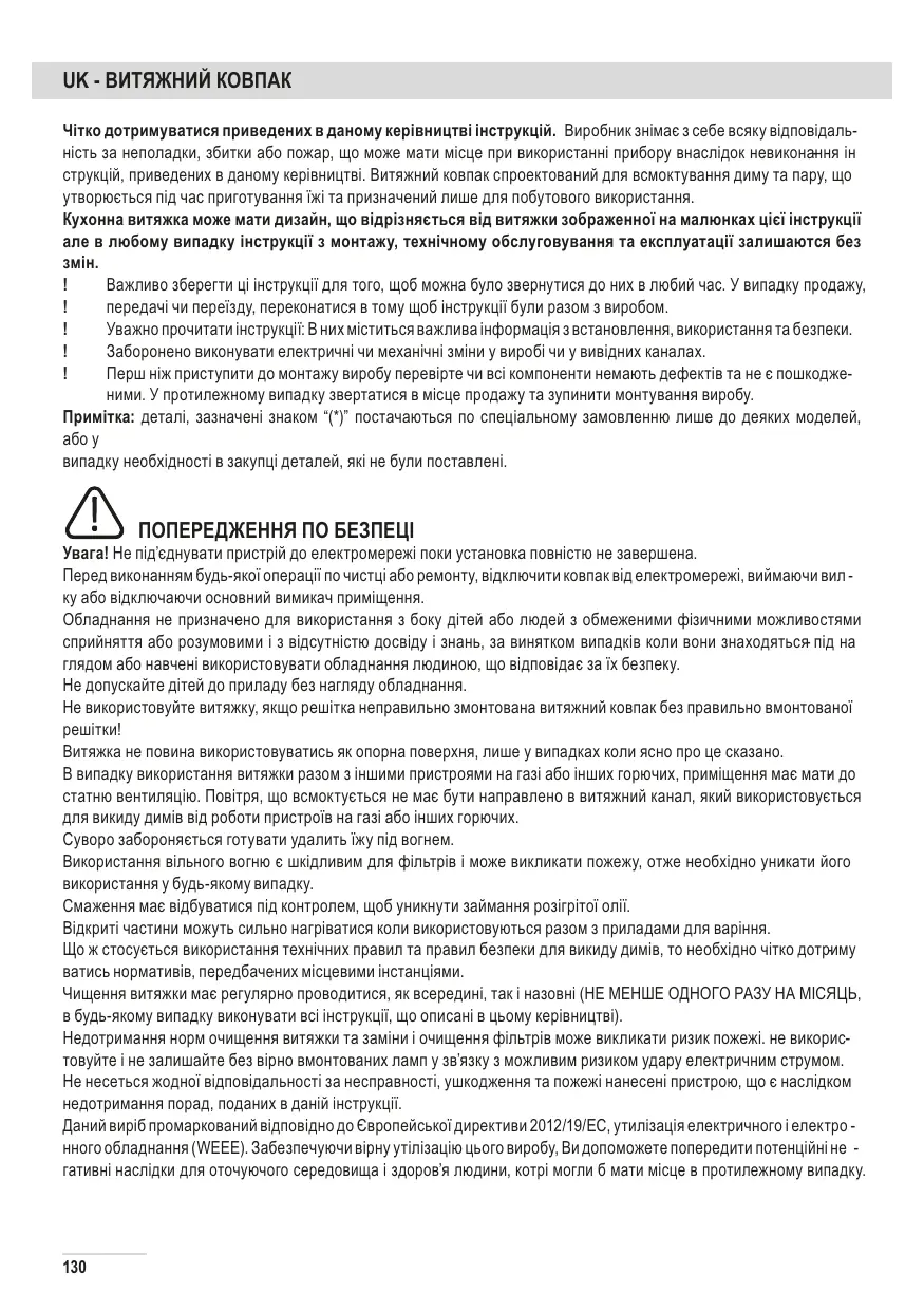 • Sécurité : EN/CEI 60335-1; EN/CEI 60335-2-31, EN/CEI 62233. ATTENTION! Ne pas installer les vis et les éléments de fixation conformément à ces instructions peut entraîner des risques électriques.