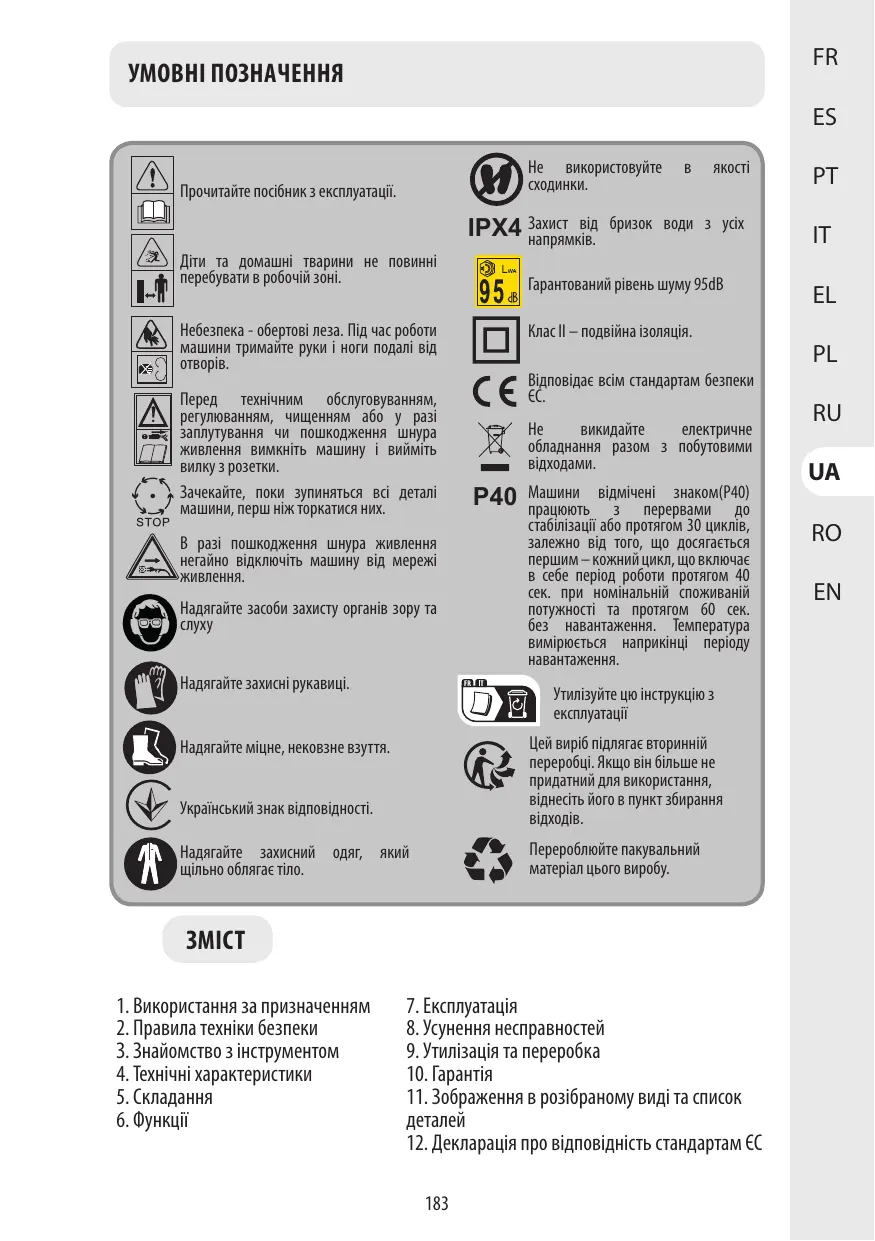 Les pannes résultant d'une usure normale ou d'une utilisation inappropriée du produit ne sont pas couvertes par la garantie. Cela indut, entre autres, les interrupteus, le disjoncteur de sécurité etles moteurs en cas d'usure.