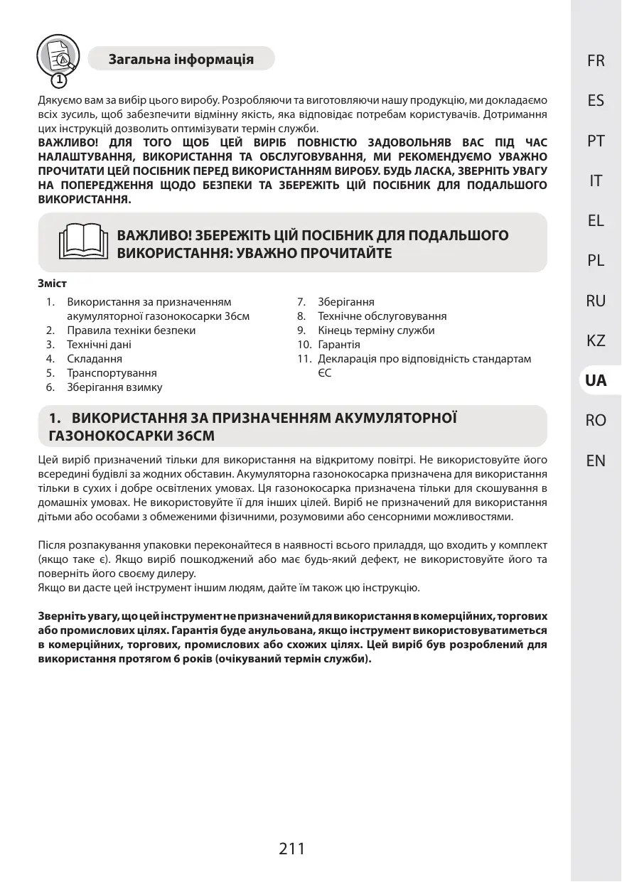 1. Usage conforme de la tondeuse à batterie 6. Hivernage