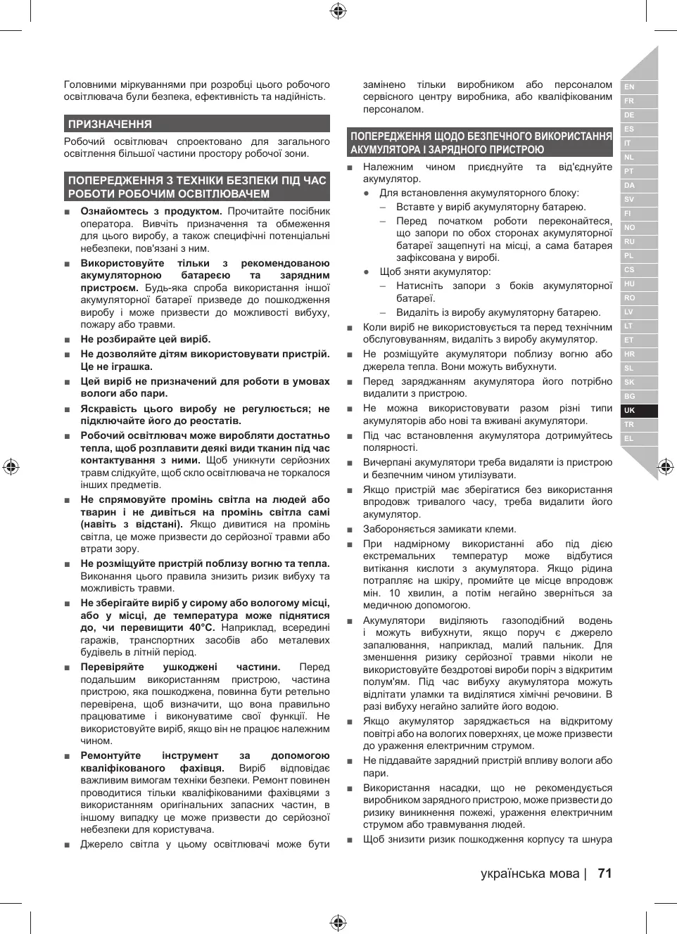 = Apprenez à connaître le produit. Lisez avec attention le manuel d'utilisation. Prenez connaissance des applications et des limitations de l'appareil ainsi que des risques potentiels spécifiques qui lui sont attachés. Utilisez uniquement la batterie et le chargeur fournis ou recommandés. Toute tentative d'utilisation d'un autre bloc de batterie endommagera le produit et serait susceptible de provoquer une explosion, un incendie, ou des blessures. Ne démontez pas le produit. Ne laissez aucun enfant utiliser le produit Ce n'est pas un jouet. Ce produit n'est pas conçu pour fonctionner dans des conditions humides ou mouillées. Ce produit n’est pas variable ; ne le connectez pas à des variateurs. Si le verre de la lampe de travail est enveloppé ou placé en contact avec un tissu, il est susceptible de produire suffisamment de chaleur pour faire fondre le tissu. Pour éviter toute blessure grave, ne laissez jamais le verre de la lampe de travail entrer en contact avec quoi que ce soit. Ne dirigez pas le faisceau de lumière sur les personnes et les animaux et ne regardez pas dans le faisceau vous-même (même à distance). Regarder le faisceau peut entraîner des lésions graves voire la perte de la vision. Ne posez pas le produit ou le bloc de batterie à proximité d'un feu ou d’une source de chaleur. Vous réduirez ainsi les risques d'explosion et de blessures. Ne stockez pas le produit dans un endroit humide ou mouillé, ou dans un endroit dont la température est susceptible d'atteindre ou de dépasser 40°C. Par exemple, dans une remise extérieure, un véhicule ou un bâtiment en tôle pendant l'été. Vérifiez qu'aucune pièce n'est endommagée. Avant toute utilisation prolongée du produit, une pièce endommagée doit être examinée prudemment afin de déterminer si elle va fonctionner correctement et comme prévu. N'utilisez pas le produit s’il ne fonctionne pas correctement. =_ Faites réparer votre outil par du personnel qualifié. Cet outil électrique est conforme aux normes légales de sécurité. Les réparations ne doivent être effectuées que par du personnel qualifié utilisant des pièces de rechange d'origine; dans le cas contraire, l'utilisateur s'exposerait à de graves dangers. = La source lumineuse contenue dans ce luminaire doit être remplacée uniquement pas le fabricant ou un de