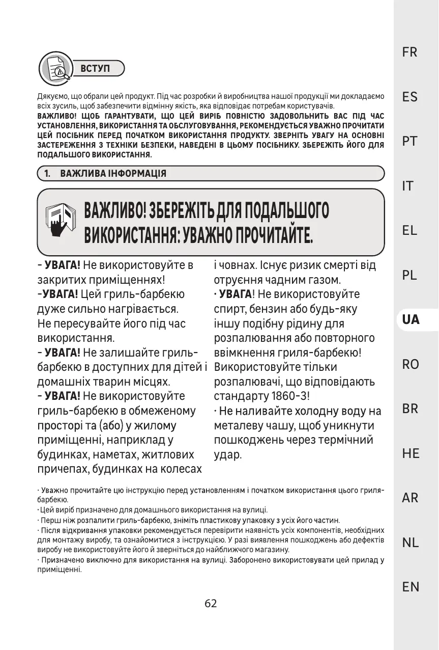 -Ce produit est prévu pour un usage domestique et extérieur. - Retirez l'emballage en plastique des toutes Les parties avant d'allumer Le barbecue.