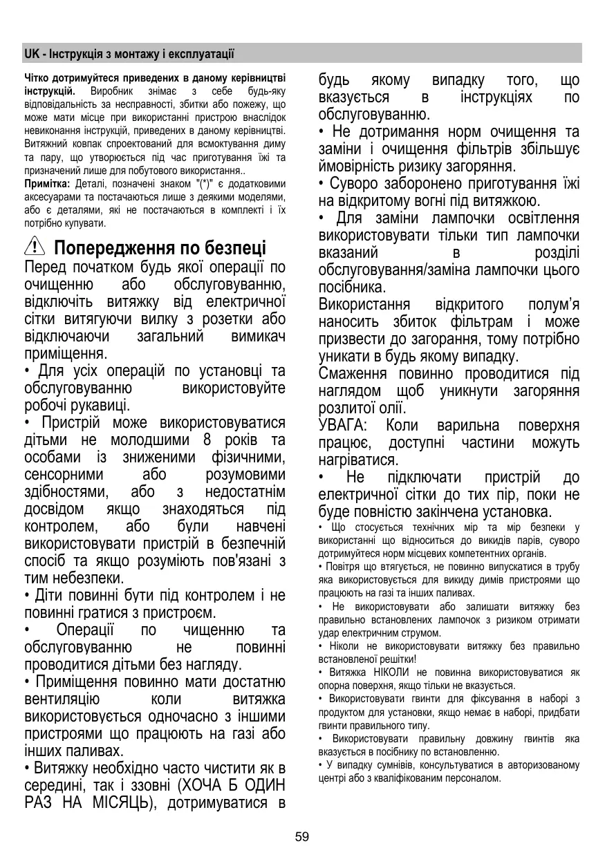 + Ne pas utiliser ou laisser la hotte sans les lampes correctement montées, car un éventuel risque de choc