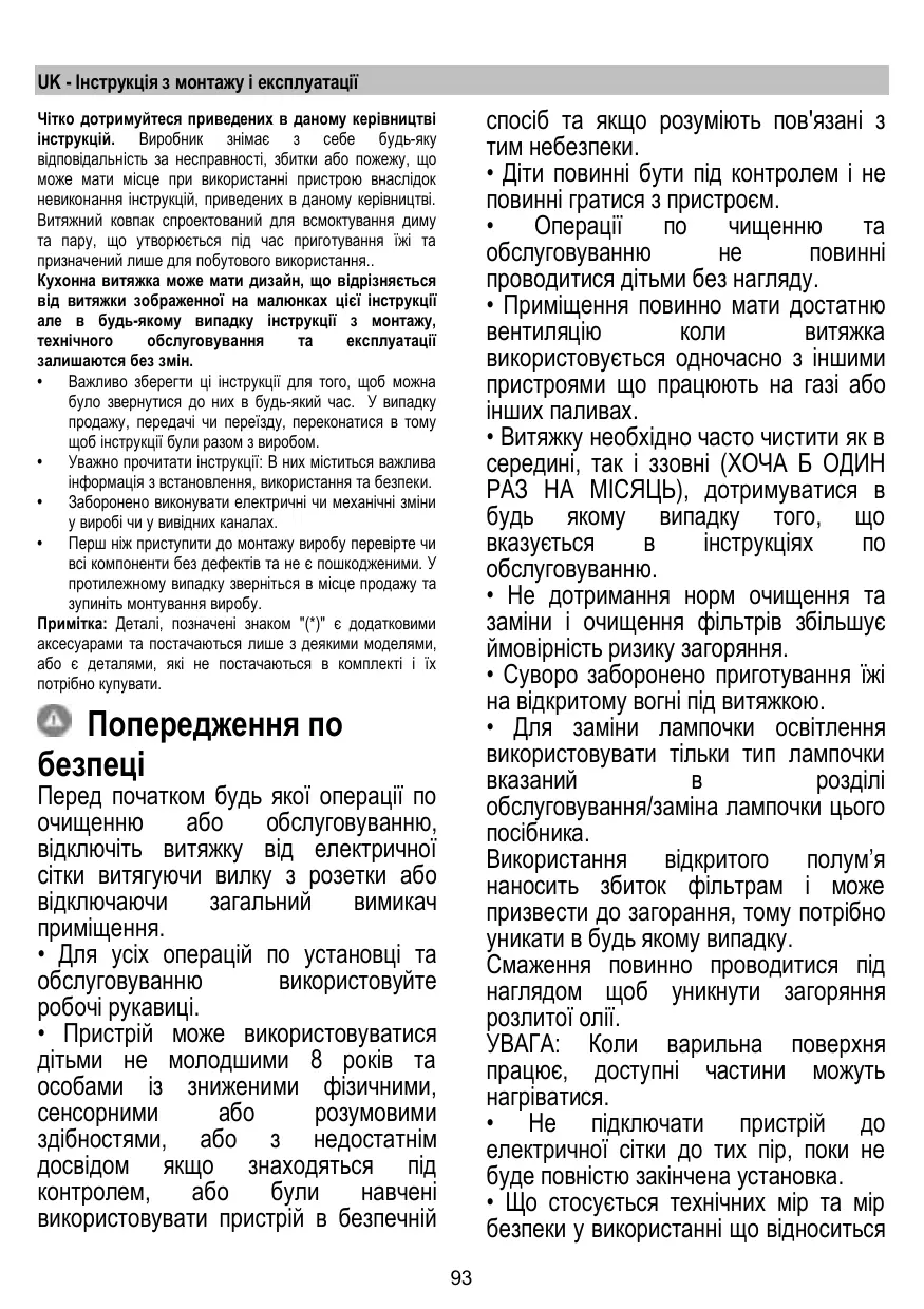 + La hotte ne doit JAMAIS être utilisée comme une surface d'appui, sauf indication expresse.