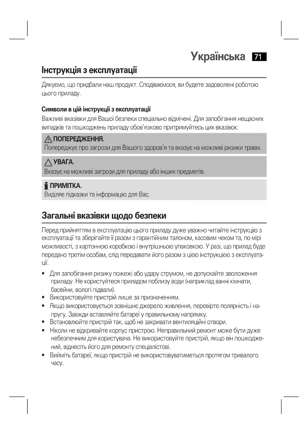 Перед прийняттям в експлуатацію цього приладу дуже уважно читайте інструкцію з