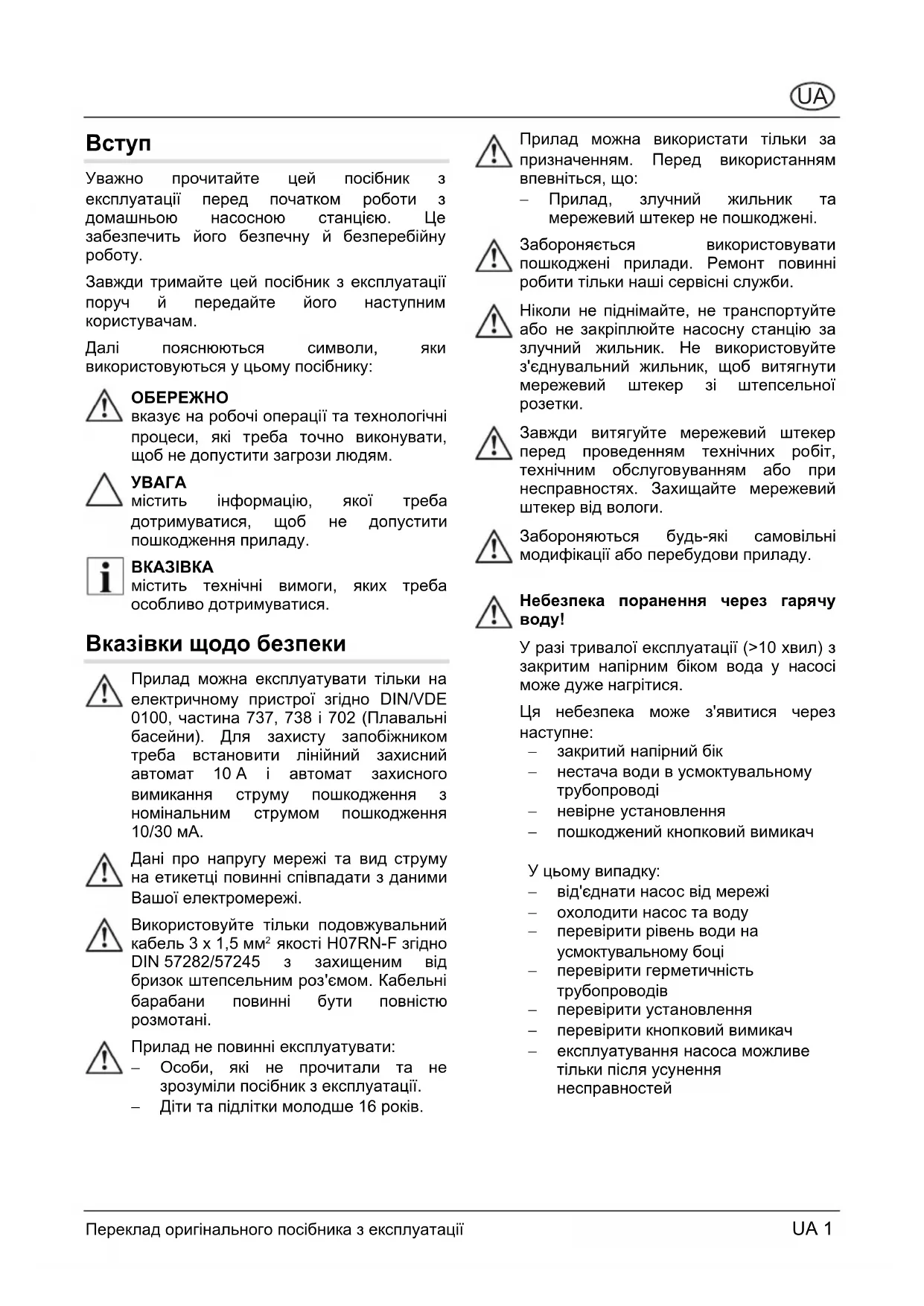 − закритий напірний бік − нестача води в усмоктувальному трубопроводі − невірне установлення − пошкоджений кнопковий вимикач У цьому випадку: − від'єднати насос від мережі − охолодити насос та воду − перевірити рівень води на усмоктувальному боці − перевірити герметичність трубопроводів − перевірити установлення − перевірити кнопковий вимикач − експлуатування насоса можливе тільки після усунення несправностейUA 2 Переклад оригінального посібника з експлуатації Призначення Використання за призначенням Домашня насосна станція призначена для приватного використання в будинку та саду. Її можна експлуатувати тільки за призначенням згідно з технічними даними. Прилад призначений виключно для наступних цілей: − зрошування саду та земельної ділянки − водопостачання в будинку − підвищення друку домашнього водопостачання. Дотримуйтесь при цьому місцевих приписів. Для цього зверніться