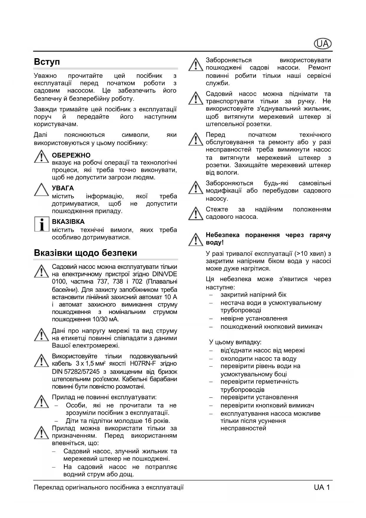− закритий напірний бік − нестача води в усмоктувальному трубопроводі − невірне установлення − пошкоджений кнопковий вимикач У цьому випадку: − від'єднати насос від мережі − охолодити насос та воду − перевірити рівень води на усмоктувальному боці − перевірити герметичність трубопроводів − перевірити установлення − перевірити кнопковий вимикач − експлуатування насоса можливе тільки після усунення несправностей Переклад оригінального посібника з експлуатації UA 1Призначення UA 2 Переклад оригінального посібника з експлуатації Використання за призначенням Садовий насос призначений для приватного використання в будинку та саду. Його можна експлуатувати тільки за призначенням згідно з технічними даними. Садовий насос призначений виключно для наступних цілей: − для зрошування та поливання (напр., зелених насаджень, овочевих грядок та