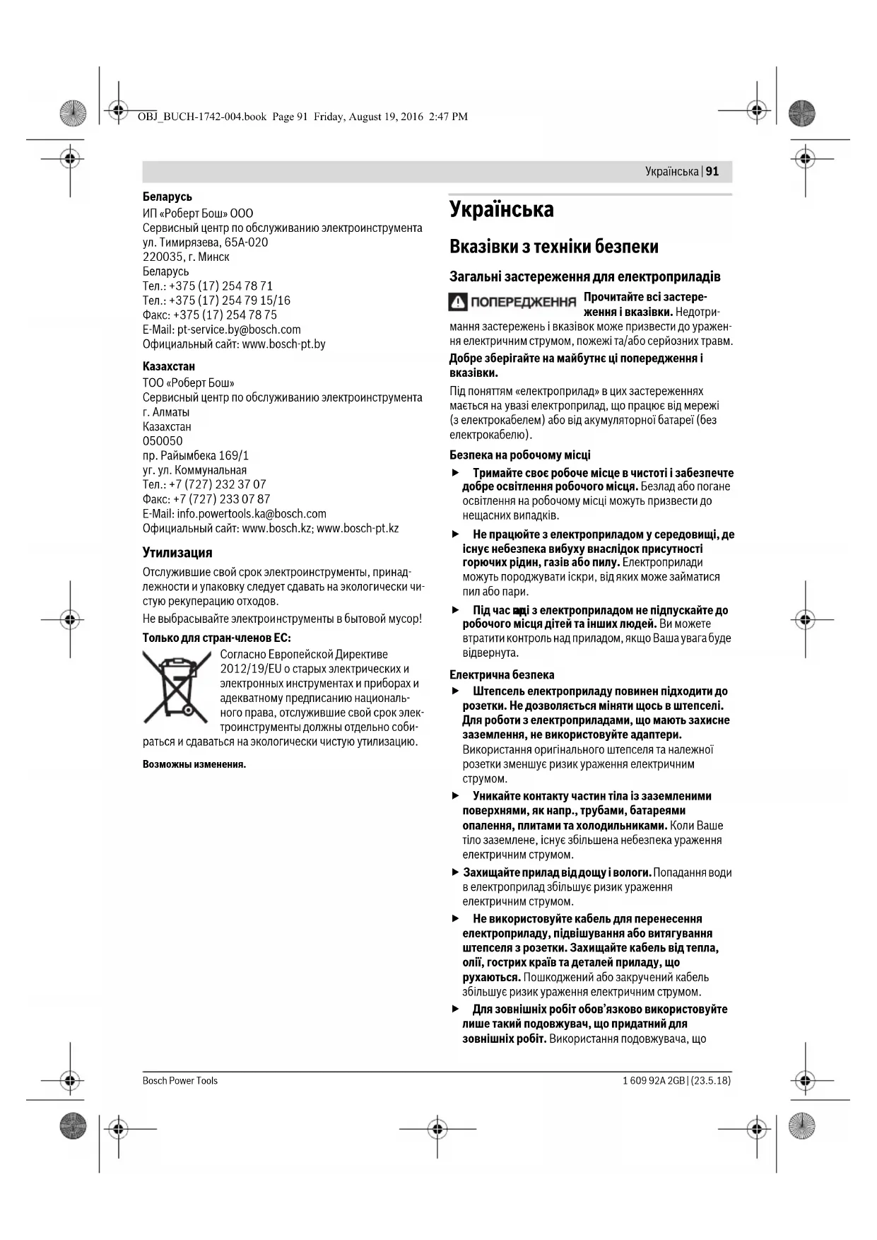 Зняття кахлю Обробка цегл Обробка бетону OBJ_BUCH-1742-004.book Page 95 Friday, August 19, 2016 2:47 PM96 | Қaзақша 1 609 92A 2GB | (23.5.18) Bosch Power Tools розділі «Сервіс та надання консультацій щодо використання продукції», стор. 96. Сервіс та надання консультацій щодо використання продукції Сервісна майстерня відповість на запитання стосовно ремонту і технічного обслуговування Вашого виробу. Малюнки в деталях і інформацію щодо запчастин можна знайти за адресою: www.bosch-pt.com Команда співробітників Bosch з надання консультацій щодо використання продукції із задоволенням відповість на Ваші запитання стосовно нашої продукції та приладдя