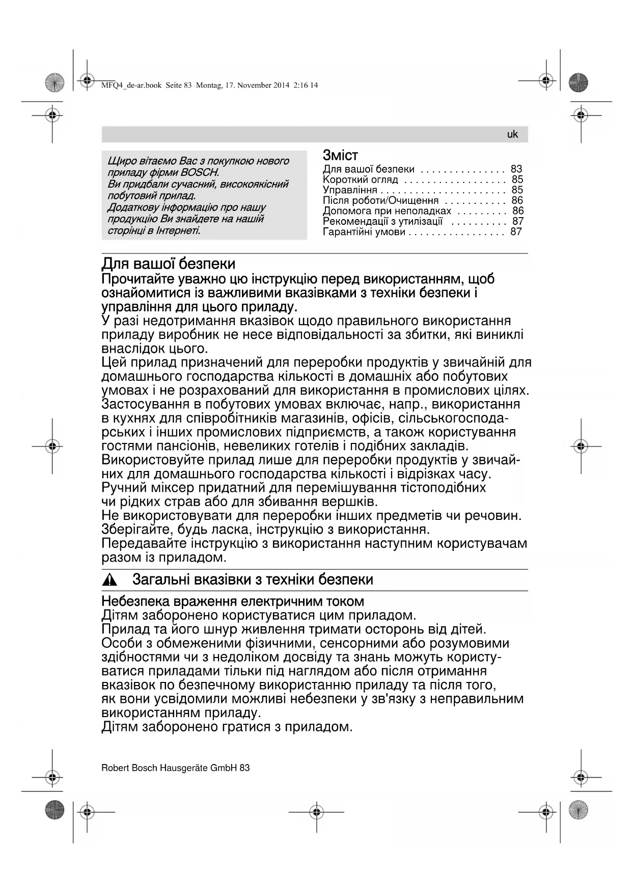 MFQ4_de-ar.book Seite 82 Montag, 17. November 2014 2:16 1483Robert Bosch Hausgeräte GmbH 83 Зміст Для вашої безпеки . . . . . . . . . . . . . . . 83Kороткий огляд . . . . . . . . . . . . . . . . . . 85Управлiння . . . . . . . . . . . . . . . . . . . . . . 85Після роботи/Очищення . . . . . . . . . . . 86Допомога при неполадках . . . . . . . . . 86Рекомендації з утилізації . . . . . . . . . . 87Гарантійні умови . . . . . . . . . . . . . . . . . 87 Для вашої безпеки