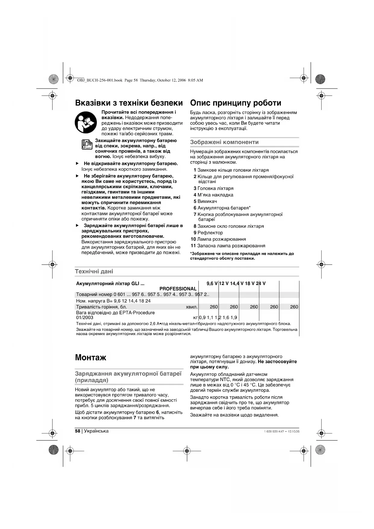 Аккумуляторы, батареи: Ni-Cd: Никель-кадмиевые Внимание: Эти аккумуляторы содержат кадмий – тяжелый металл повышенной ядовитости. Ni-MH: Никель-металлогидридные Не выбрасывайте аккумуляторы/батареи в коммунальный мусор, не бросайте их в огонь или в воду. Аккумуляторы/батареи следует собирать и сдавать на рециркуляцию или на экологически чистую утилизацию. Только для стран-членов ЕС: Неисправные или пришедшие в негодность аккумуляторы/батареи должны быть утилизированы согласно Директиве 91/157/ЕЭС. Оставляем за собой право на изменения. OBJ_BUCH-256-001.book Page 57 Thursday, October 12, 2006 8:05 AM58 | Українська 1 609 929 K47 • 12.10.06 Вказівки з техніки безпеки Прочитайте всі попередження і вказівки. Недодержання попе- реджень і вказівок може призводити до удару електричним струмом, пожежі та/або серйозних травм. Захищайте акумуляторну батарею від спеки, зокрема, напр., від сонячних променів, а також від вогню. Існує небезпека вибуху. f Не відкривайте акумуляторну батарею. Існує небезпека короткого замикання. f Не зберігайте акумуляторну батарею, якою Ви саме не користуєтесь, поряд із канцелярськими скріпками, ключами, гвіздками, гвинтами та іншими невеликими металевими предметами, які можуть спричинити перемикання контактів. Коротке замикання між контактами акумуляторної батареї може спричиняти опіки або пожежу. f Заряджайте акумуляторні батареї лише в заряджувальних пристроях, рекомендованих виготовлювачем. Використання заряджувального пристрою для акумуляторних батарей, для яких він не передбачений, може призводити до пожежі. Опис принципу роботи Будь ласка, розгорніть сторінку із зображенням акумуляторного ліхтаря і залишайте її перед собою увесь час, коли Ви будете читати інструкцію з експлуатації. Зображені компоненти Нумерація зображених компонентів посилається на зображення акумуляторного ліхтаря на сторінці з малюнком. 1 Замкове кільце головки ліхтаря 2 Кільце для регулювання променя/фокусної