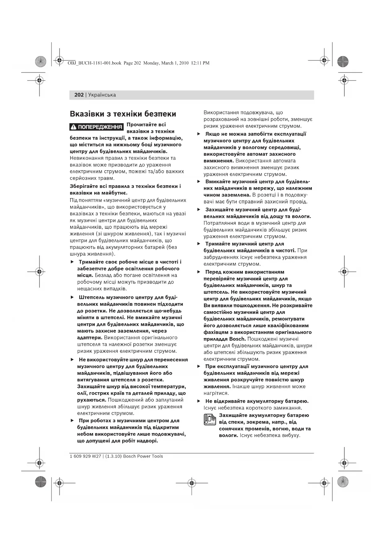 USB) OBJ_BUCH-1181-001.book Page 203 Monday, March 1, 2010 12:11 PM204 | Українська 1 609 929 W27 | (1.3.10) Bosch Power Tools Зображені компоненти Нумерація зображених компонентів посилається на зображення музичного центру для будівельних майданчиків на сторінці з