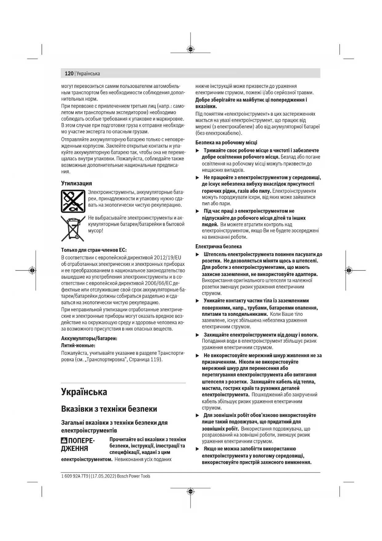 Лише для країнЄС: Відповідно до Європейської Директиви 2012/19/EU щодо відходів електричного та електронного обладнання та її перетворення в національне законодавство електроінструменти, які більше не придатні до використання, а також відповідно до Європейської Директиви 2006/66/EC несправні або відпрацьовані акумуляторні батареї/батарейки повинні здаватися окремо і утилізуватися екологічно чистим способом. При неправильній утилізації відпрацьовані електричні та електронні прилади можуть мати шкідливий вплив на навколишнє середовище та здоров’я людини через можливу наявність небезпечних речовин. Акумулятори/батарейки: Літієво-іонні: Будь ласка, зважайте на вказівки в розділі Транспортування (див. „Транспортування“, Сторінка126).