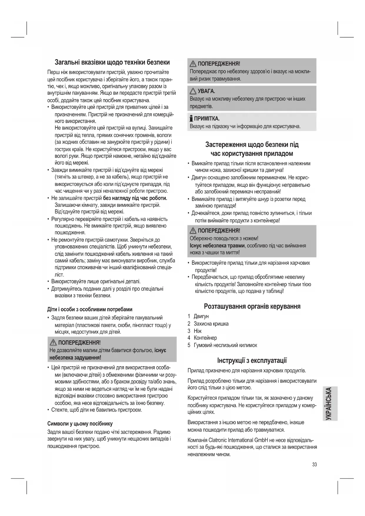 Прилад призначено для нарізання харчових продуктів. Прилад розроблено тільки для нарізання і використовувати його слід тільки з цією метою. Користуйтеся приладом тільки так, як зазначено у даному посібнику користувача. Не користуйтеся приладом у комер- ційних цілях. Використання з іншою метою не передбачено, інакше можна пошкодити прилад або травмуватися. Компанія Clatronic International GmbH не несе відповідаль- ності за будь-які пошкодження, що сталися за використання неналежним чином.34