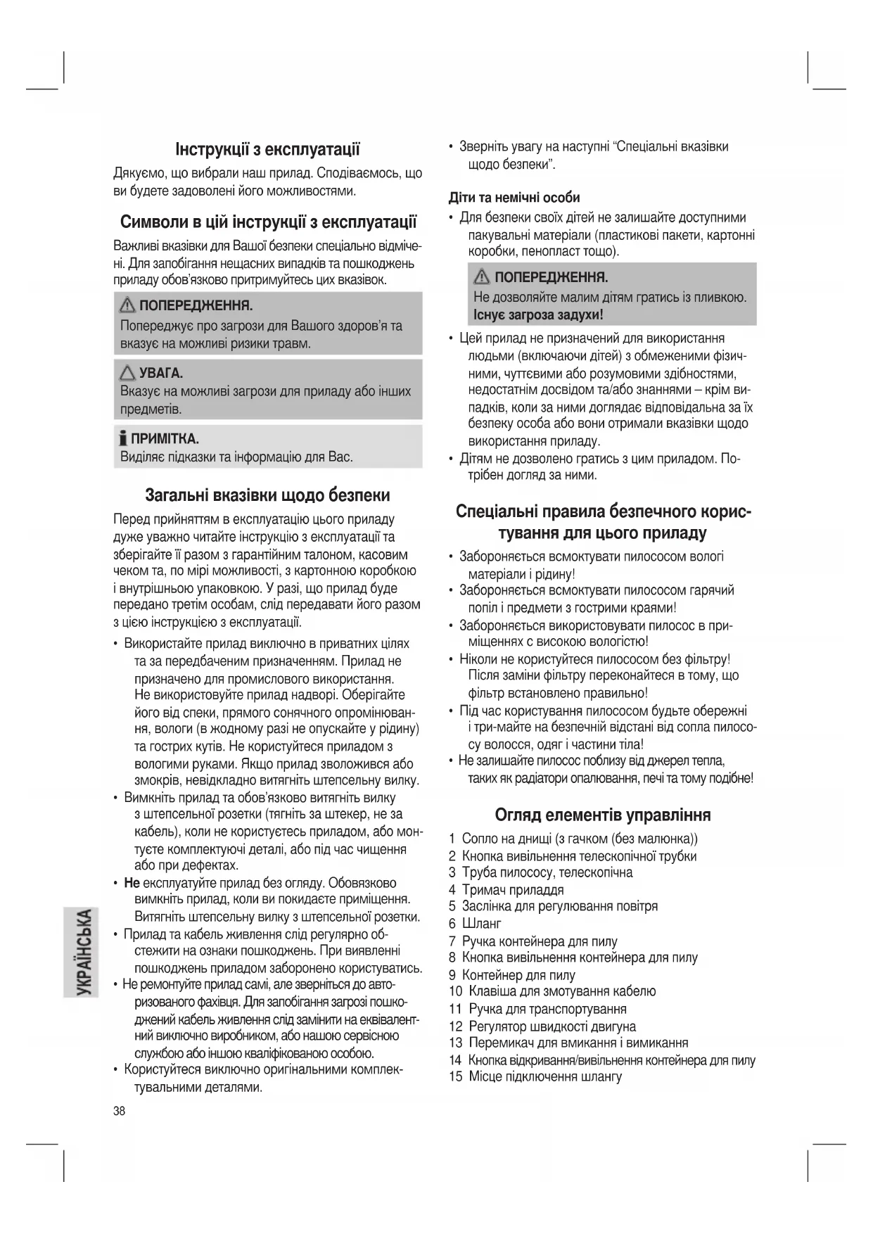- Під час користування пилососом будьте обережні і три-майте на безпечній відстані від сопла пилосо- су волосся, одяг і частини тіла!