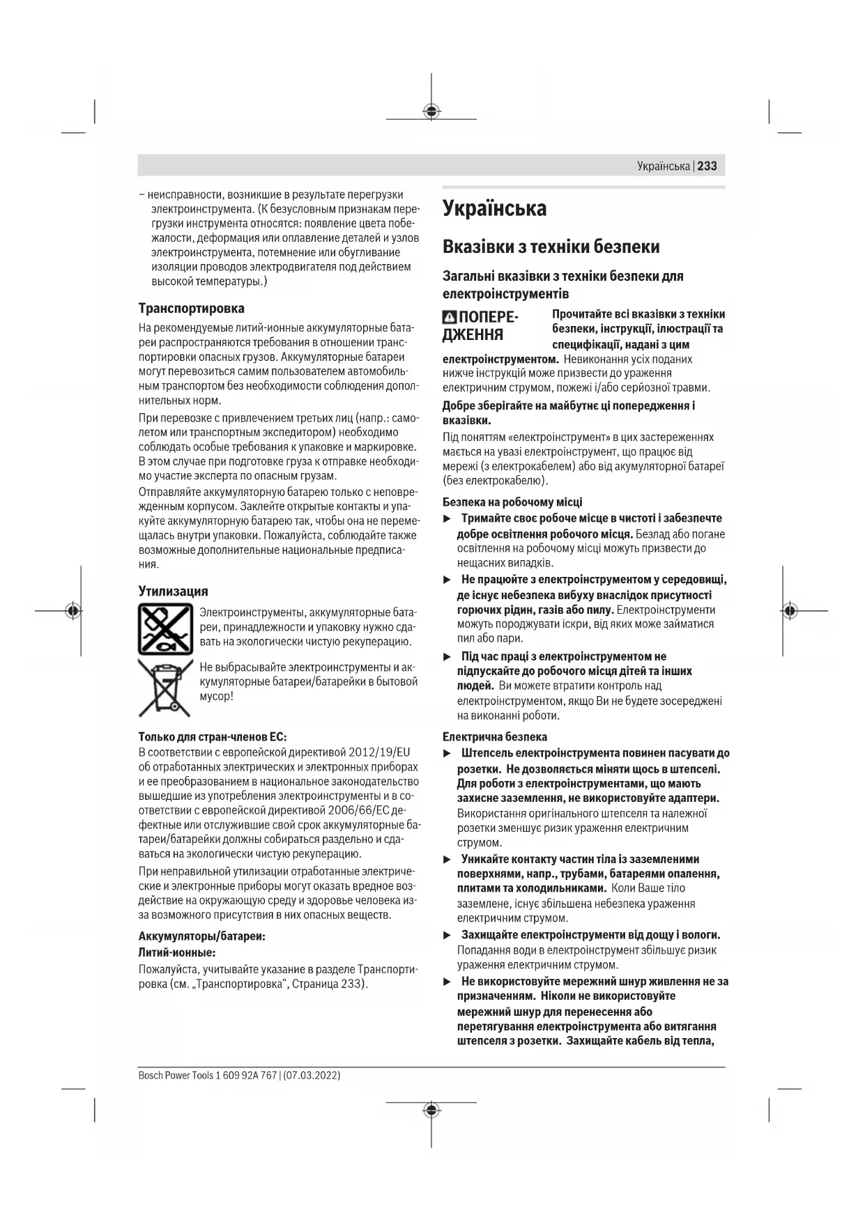 штепселя з розетки. Захищайте кабель від тепла, Bosch Power Tools 1 609 92A 767 | (07.03.2022)234 | Українська