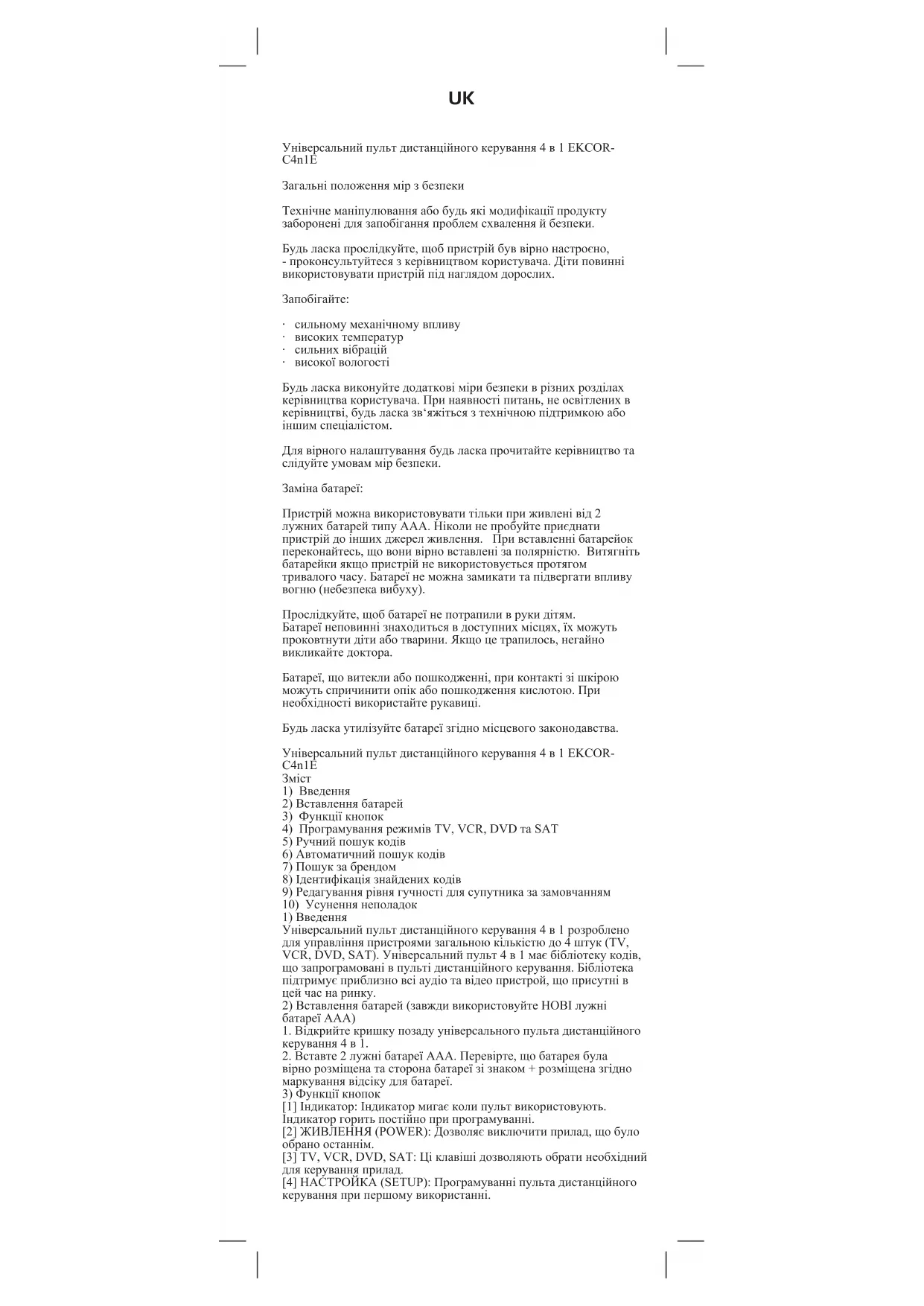 - високоївологості Будьласкавиконуйтедодатковімірибезпекиврізнихрозділах керівництвакористувача.Принаявностіпитань,неосвітленихв керівництві,будьласказв‘яжітьсязтехнічноюпідтримкоюабо іншимспеціалістом. Длявірногоналаштуваннябудьласкапрочитайтекерівництвота слідуйтеумоваммірбезпеки. Замінабатареї: Пристрійможнавикористовуватитількиприживленівід2 лужнихбатарейтипуААА.Ніколинепробуйтеприєднати пристрійдоіншихджерелживлення.Привставленнібатарейок переконайтесь,щовонивірновставленізаполярністю.Витягніть батарейкиякщопристрійневикористовуєтьсяпротягом тривалогочасу.Батареїнеможназамикатитапідвергативпливу вогню(небезпекавибуху). Прослідкуйте,щоббатареїнепотрапиливрукидітям. Батареїнеповиннізнаходитьсявдоступнихмісцях,їхможуть проковтнутидітиаботварини.Якщоцетрапилось,негайно викликайтедоктора. Батареї,щовитеклиабопошкодженні,приконтактізішкірою можутьспричинитиопікабопошкодженнякислотою.При необхідностівикористайтерукавиці. Будьласкаутилізуйтебатареїзгідномісцевогозаконодавства. Універсальнийпультдистанційногокерування4в1EKCOR- C4n1E