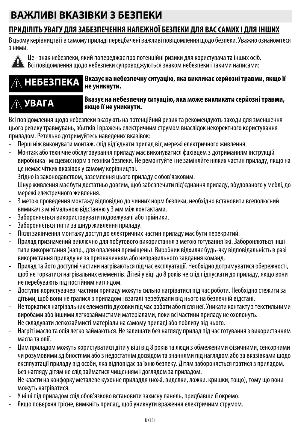- La mise à la terre de l’appareil est obligatoire. - Le cordon d’alimentation doit être assez long pour permettre de brancher au secteur l’appareil encastré dans un meuble. - Pour réaliser une installation conforme aux normes de sécurité en vigueur, prévoyez un interrupteur omnipolaire avec une ouverture minimale de 3 mm entre les contacts. - N’utilisez en aucun cas de prises multiples ou de rallonges. - Ne tirez pas sur le cordon de l’appareil. - Une fois l’installation terminée, l’utilisateur ne doit plus pouvoir accéder aux composants électriques. - La table de cuisson est un appareil électroménager conçu exclusivement pour la cuisson des aliments. Toute autre utilisation est considérée comme impropre (par ex. chauffer des locaux). Le fabricant décline toute responsabilité en cas d’usage impropre ou de mauvais réglage des commandes. - L’appareil et ses parties accessibles chauffent en cours d’utilisation. Évitez de toucher les résistances. Les enfants de moins de 8 ans doivent être tenus à distance ou être surveillés en permanence. - Les parties accessibles de la table deviennent très chaudes pendant l’utilisation. Assurez-vous que les enfants restent à l’écart et qu’ils ne jouent pas avec l’appareil. - Pendant et après l’utilisation, veillez à ne pas toucher les résistances de l’appareil. Évitez tout contact avec des chiffons ou autre matière inflammable tant que les composants de l’appareil n’ont pas refroidi. - Ne placez jamais de produits inflammables sur la table de cuisson ou à proximité. - L’huile et la graisse peuvent devenir très chaudes et s’enflamment facilement. Surveillez la cuisson des aliments qui contiennent beaucoup de graisse ou d’huile. - Cet appareil peut être utilisé par des enfants de 8 ans minimum et des personnes à capacités physiques, sensorielles ou mentales réduites, inexpérimentées ou ignorantes, sous surveillance ou après avoir reçu des instructions relatives à l’utilisation en toute sécurité de l’appareil et à condition de comprendre les risques impliqués. Ne laissez pas les enfants jouer avec l’appareil. Le nettoyage et la maintenance utilisateur ne doivent pas être réalisés par des enfants sans surveillance. - Ne déposez aucun objet métallique comme les ustensiles de cuisine (couteaux, fourchettes, cuillères, couvercles, etc.) sur les foyers, ils risqueraient de surchauffer. - Il est obligatoire d’installer une cloison de séparation (non fournie) sous l’appareil. - En cas de fissuration de la surface, mettez l’appareil hors tension pour éviter tout risque de choc électrique. FR19