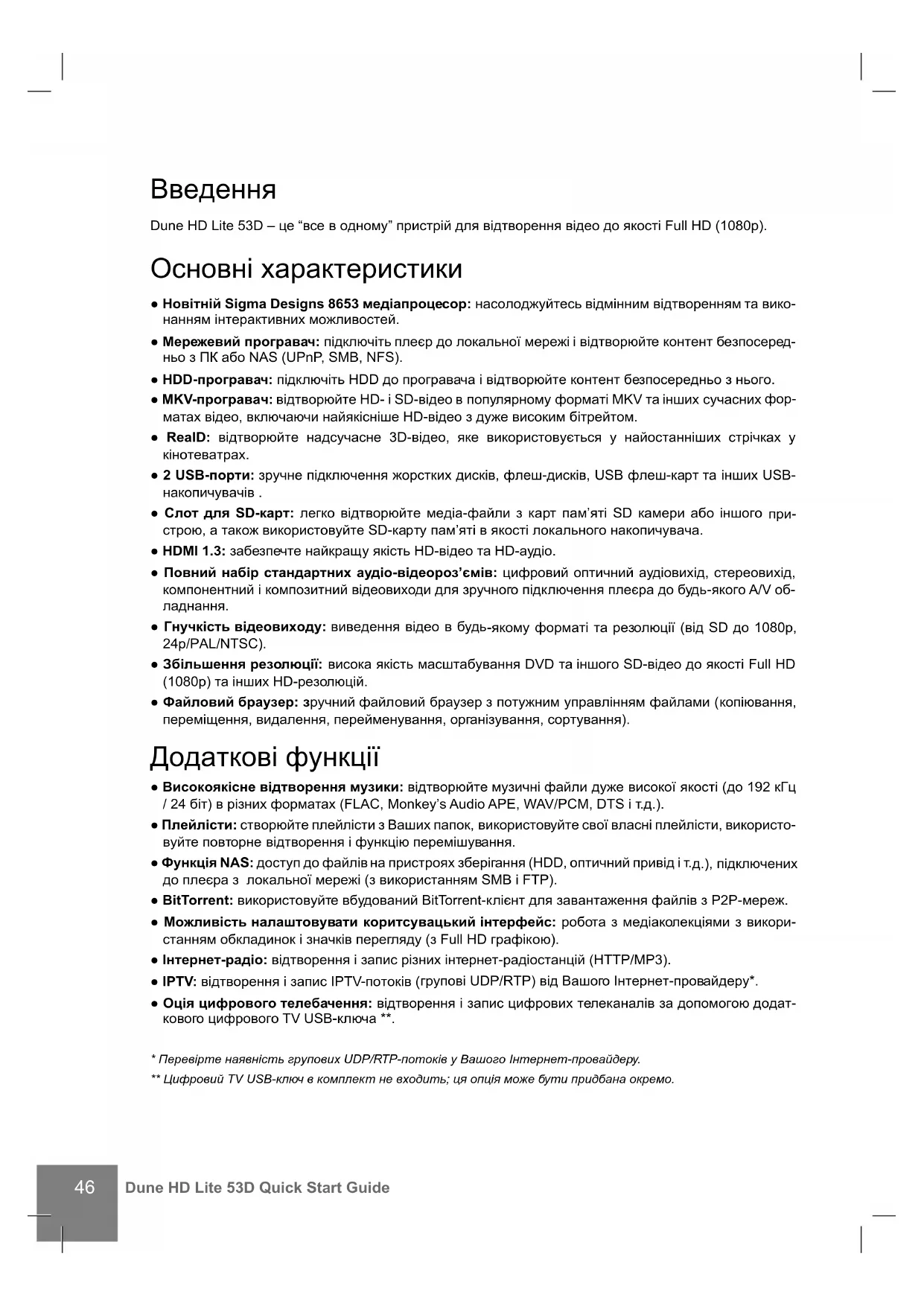 Dune HD Lite 53D – це “все в одному” пристрій для відтворення відео до якості Full HD (1080p). Основні характеристики ● Новітній Sigma Designs 8653 медіапроцесор: насолоджуйтесь відмінним відтворенням та вико- нанням інтерактивних можливостей. ● Мережевий програвач: підключіть плеєр до локальної мережі і відтворюйте контент безпосеред- ньо з ПК або NAS (UPnP, SMB, NFS). ● HDD-програвач: підключіть HDD до програвача і відтворюйте контент безпосередньо з нього. ● MKV-програвач: відтворюйте HD- і SD-відео в популярному форматі MKV та інших сучасних
